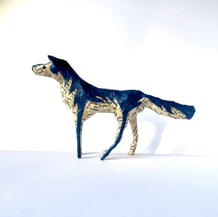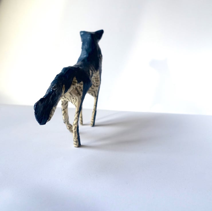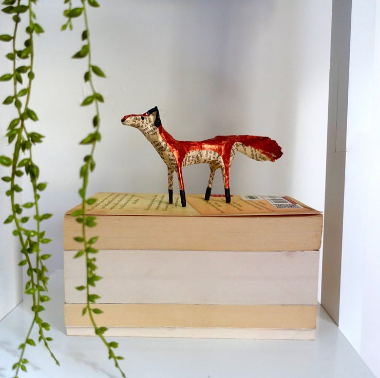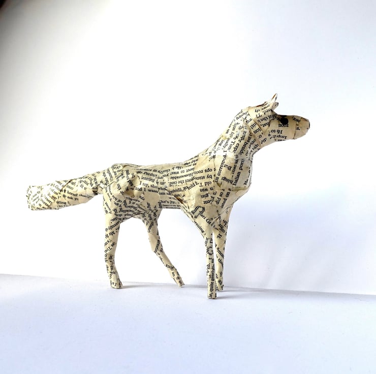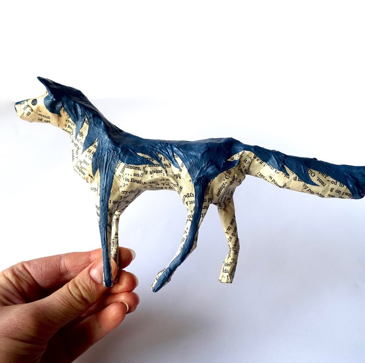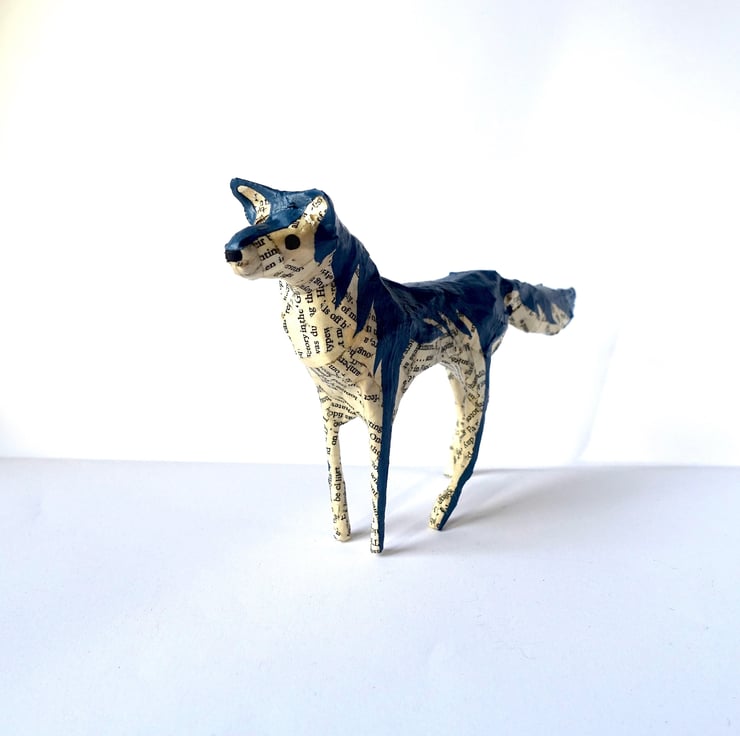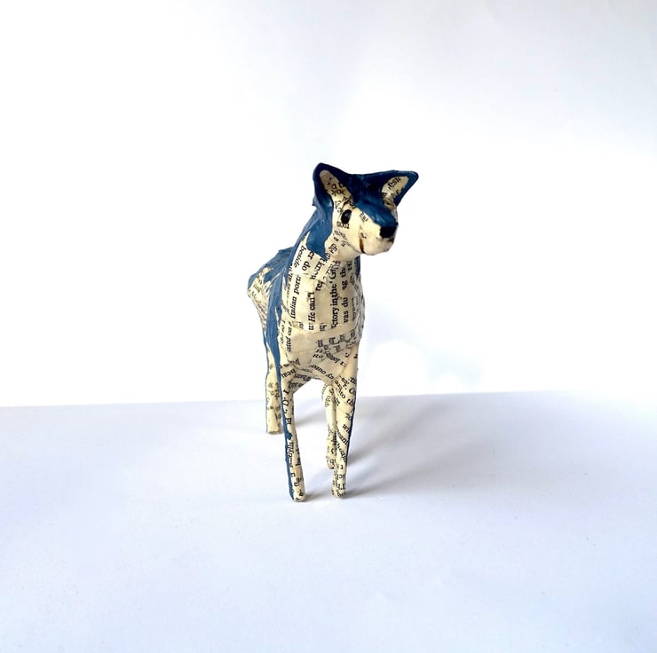 Looking for unique gifts? I created my little paper animals, hand made from recycled books, to decorate my home and bookshelves. They are intended to be three-dimensional "drawings" - I don't use any pattern or wire structure beneath the papier-mâché. Each one is therefore unique and has its own character. This little paper wolf with hand-painted coat and expression is exactly the decoration I would love to have on my Christmas shelf or in my home all year round. Ideal size for mantelpiece or shelf decor.