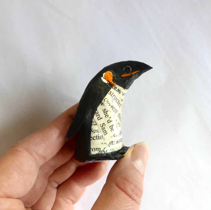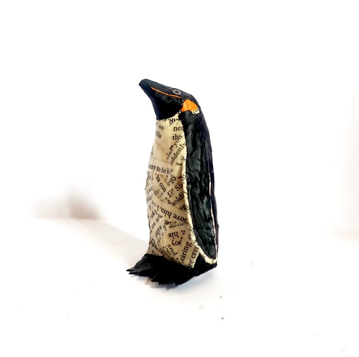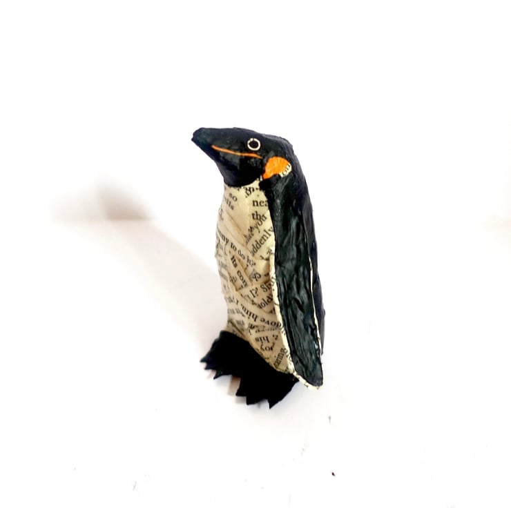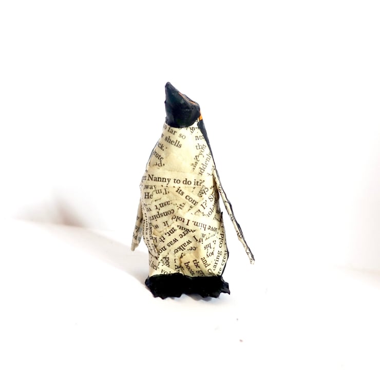 Miniature Emperor penguin bird model decoration hand made from papi r-mach . Coat colours created from recycled book pages and acrylic paint.
