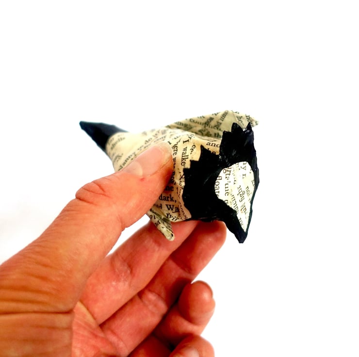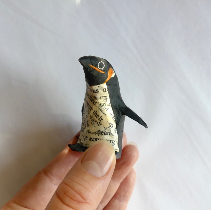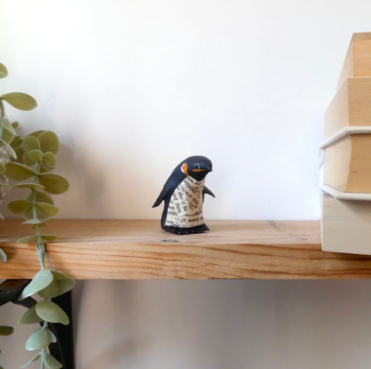 Looking for unique gifts? I created my little paper animals, hand made from recycled books, to decorate my home and bookshelves. They are intended to be three-dimensional "drawings" - I don't use any pattern or wire structure beneath the papier-mâché. Each one is therefore unique and has its own character. This little paper penguin is exactly the decoration I would love to have on my Christmas shelf or in my home all year round. Ideal size for mantel or shelf decor.