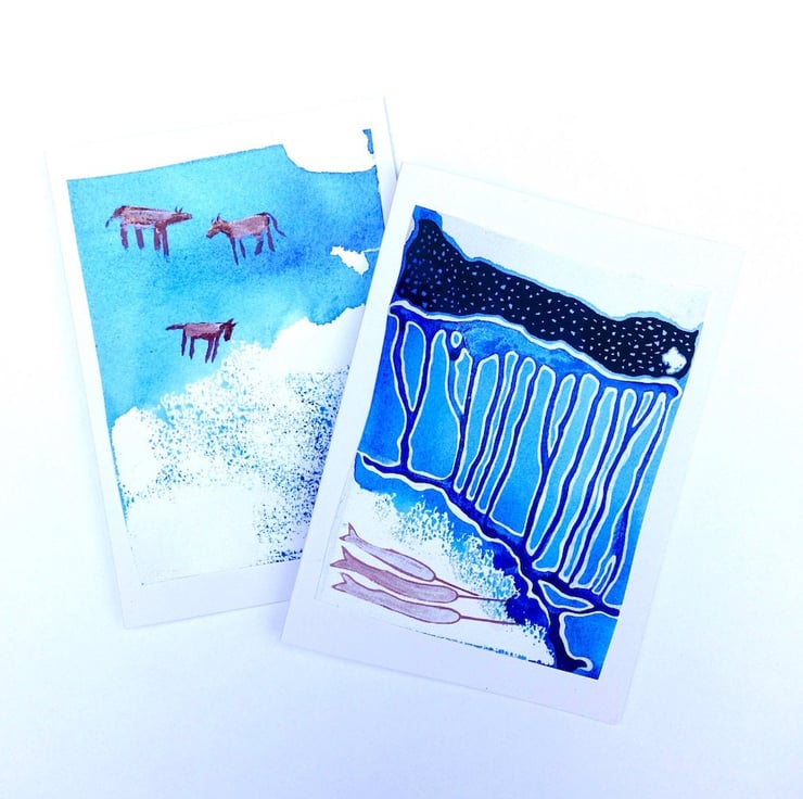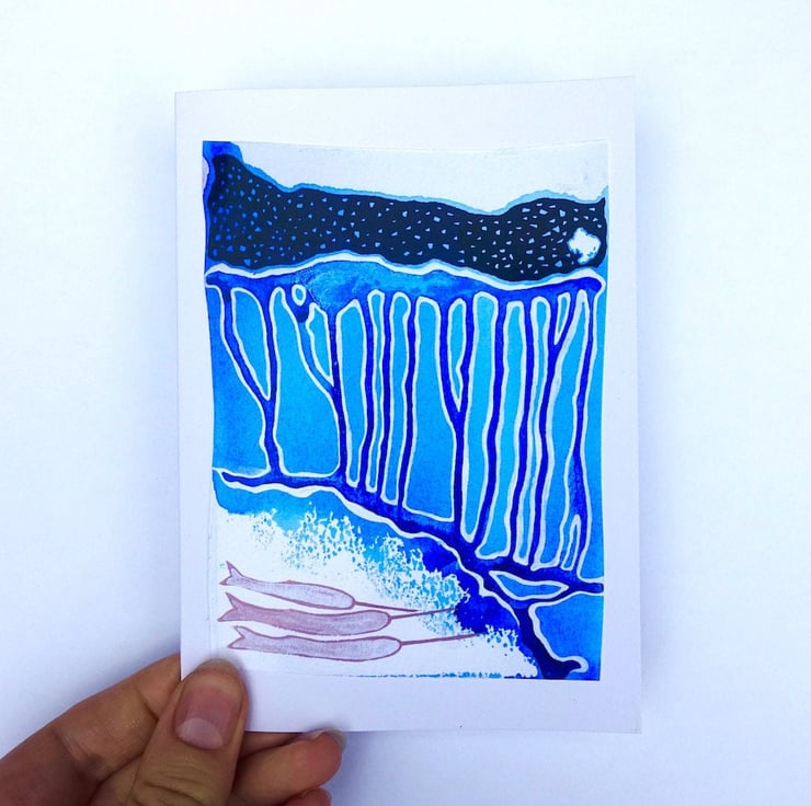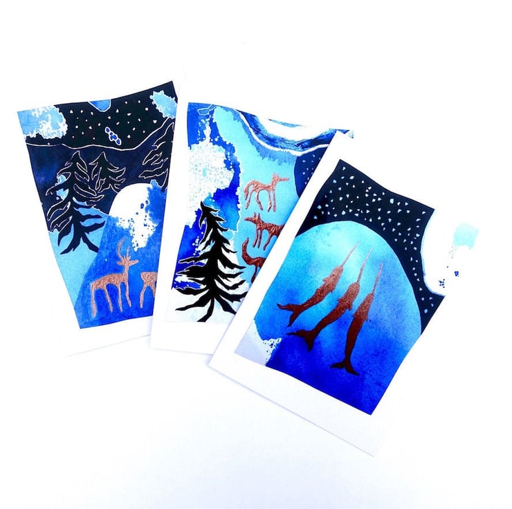 These cards are handmade from prints of my original ink paintings on thick BFK printmaking paper. The original illustrations are hand painted using acrylic and metallic inks.