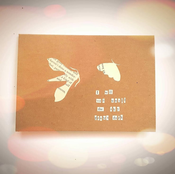 Moths made using paper from recycled old vintage book pages. Hand cut with the found poetry words. My poetry words 'I will wait until the sky grows dark'