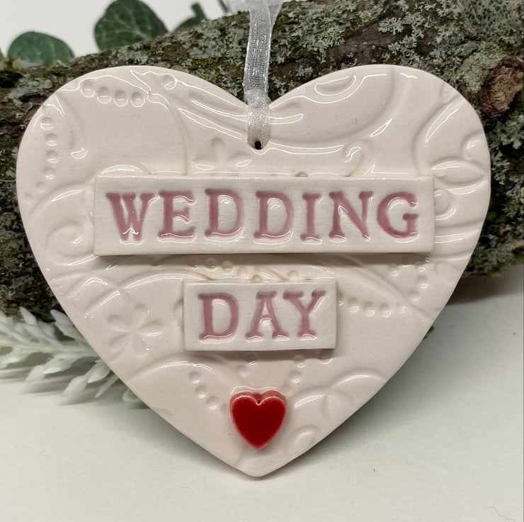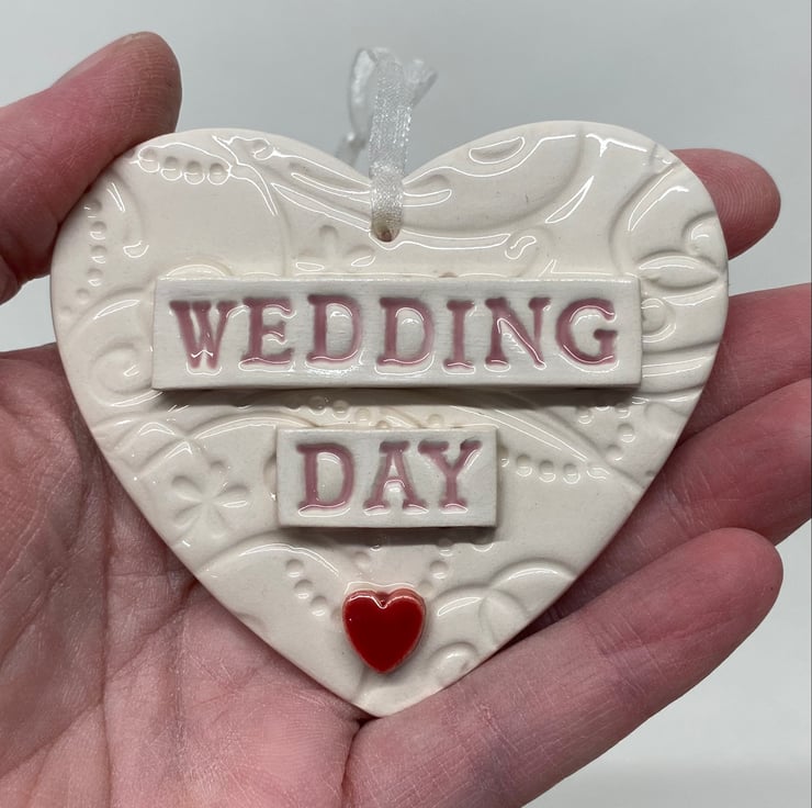 This little heart is made from white earthenware clay and imprinted with the words Wedding Day. It has been fired twice, once to the bisque stage and then a second firing for the clear glaze. It measures 7centimetres wide x 6.5cm height x 5mm thick.