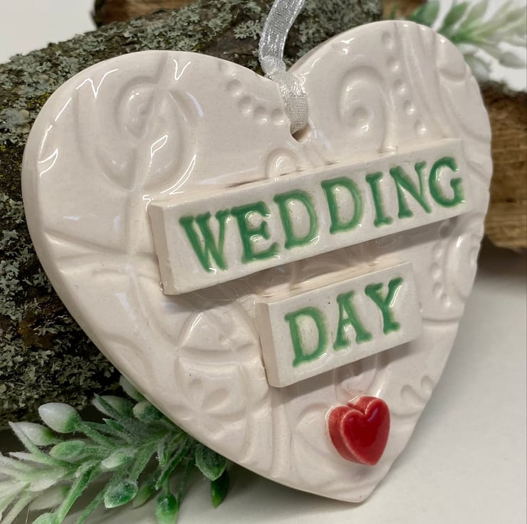 This little heart is made from white earthenware clay and imprinted with the words Wedding Day. It has been fired twice, once to the bisque stage and then a second firing for the clear glaze. It measures 7centimetres wide x 6.5cm height x 5mm thick.