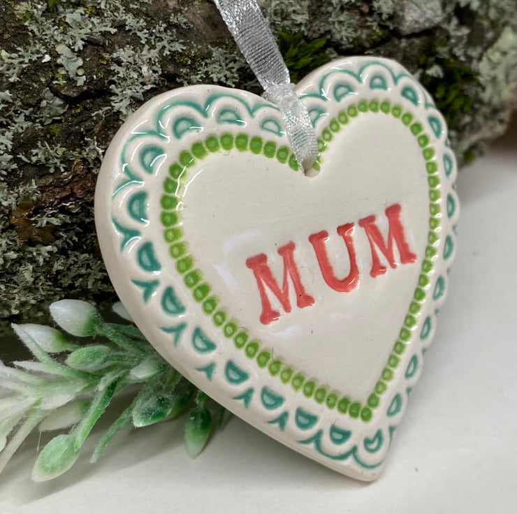 This little heart is made from white earthenware clay, imprinted with the word Mum The perfect gift to let someone know how much you love them! Some of the letters may be a bit higgledy piggledy but they have been stamped with love! It has been fired twice, once to the bisque stage and then a second firing for the clear glaze. It measures 4.5 centimetres wide x 5cm height x 5mm thick. It can be hung outside.