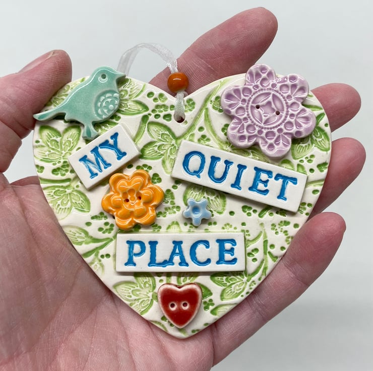 This ceramic heart is made from white earthenware clay. It has a floral theme with ceramic flowers and birds. It has been fired in an electric kiln. 10cm x 9cm. Great gift for gardeners - can be hung outside.