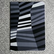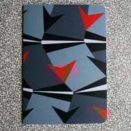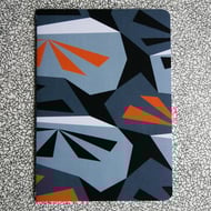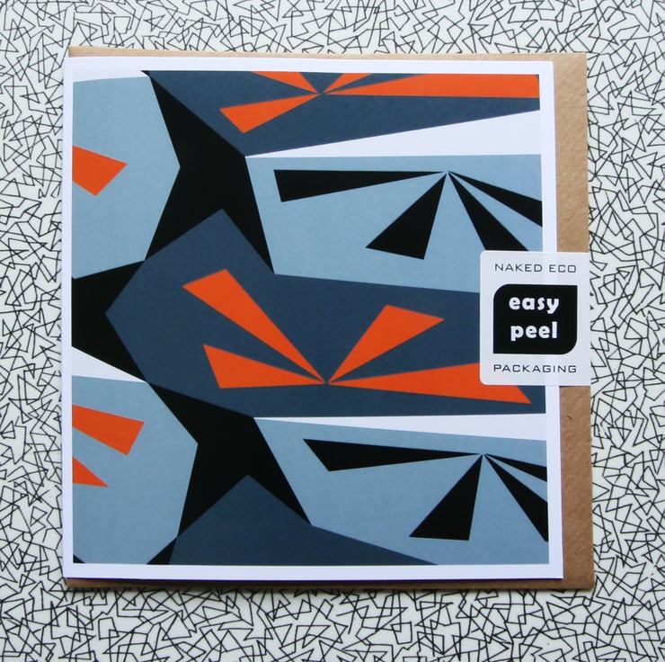 Taking inspiration from the striking geometric shapes found on naval camouflage, this design features orange sunbursts on a background of grey tones.
