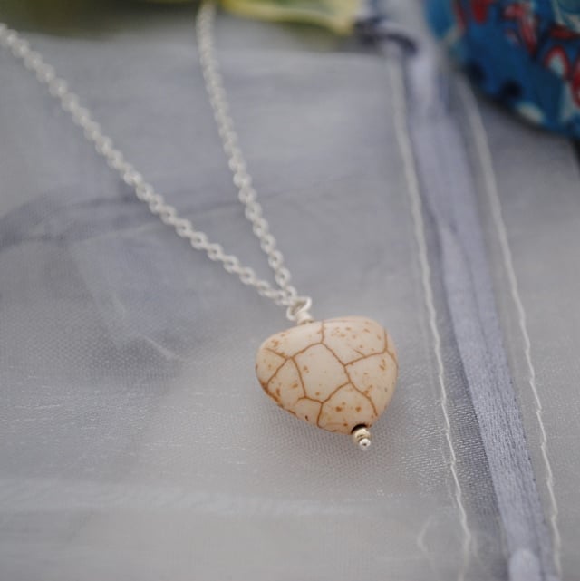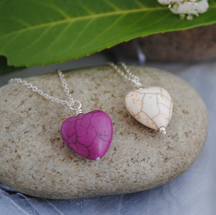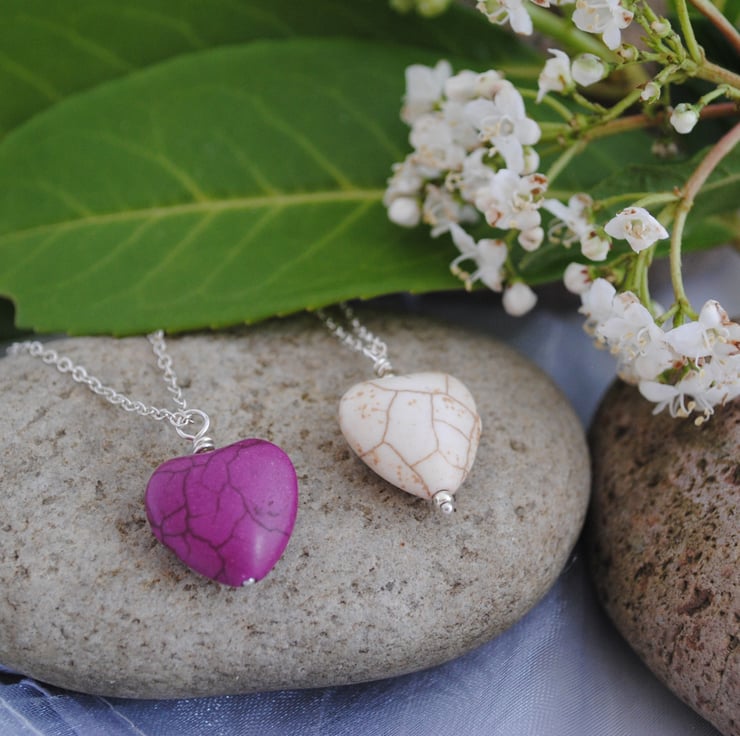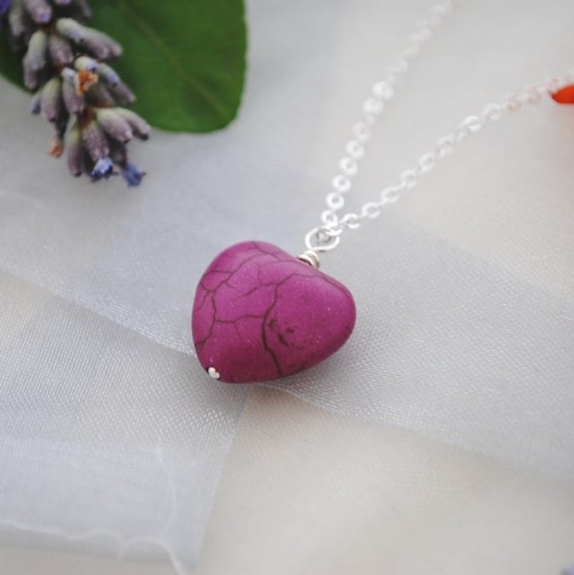 This pendant necklace is made with a 10mm howlite heart which is hand-wrapped and a silver-plated fine open linked chain. The silver chain is 45 cm / 18 inches in length and finished with a lobster or bolt clasp. The length can be altered on request. The necklace is available in purple and white.