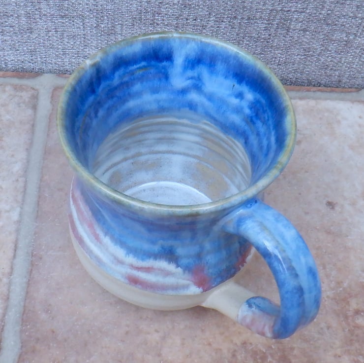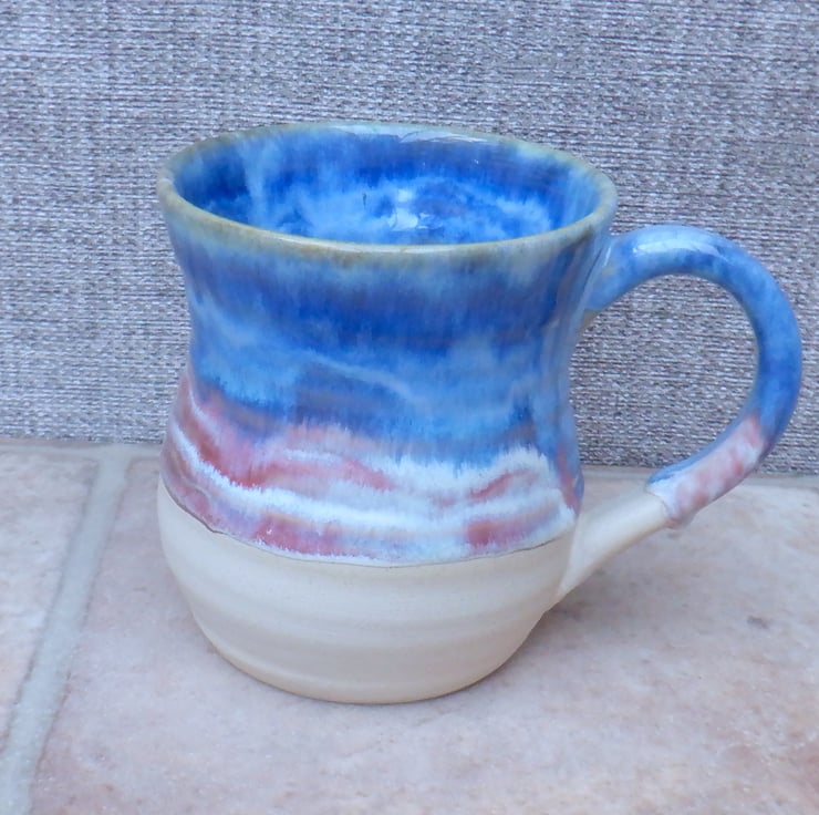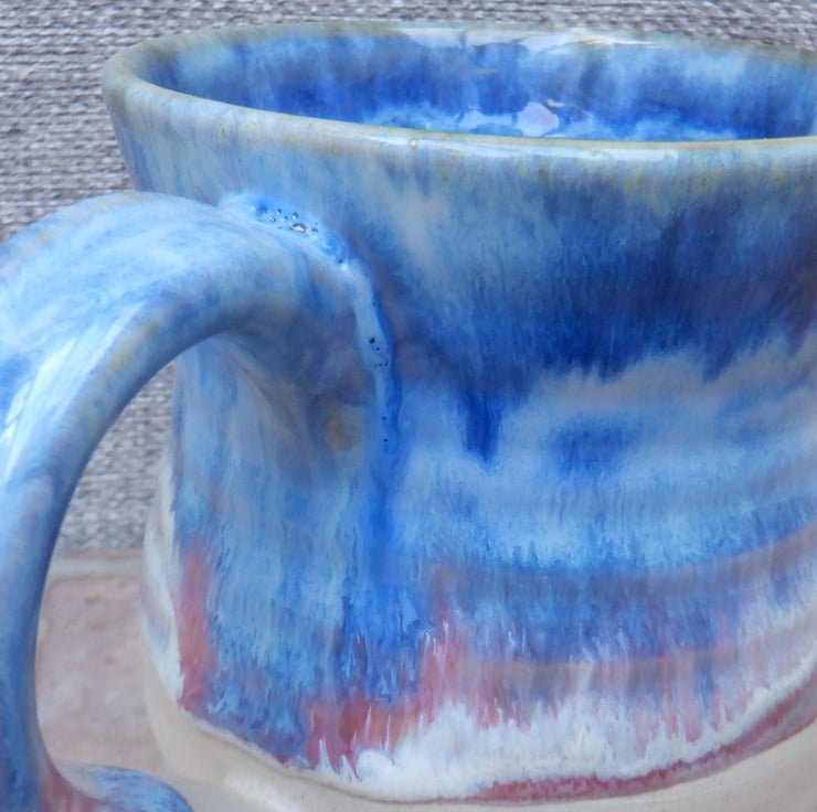 I threw this mug on my pottery wheel using strong off-white stoneware clay, and finished it in a layered combination of pink and blue reactive glazes.