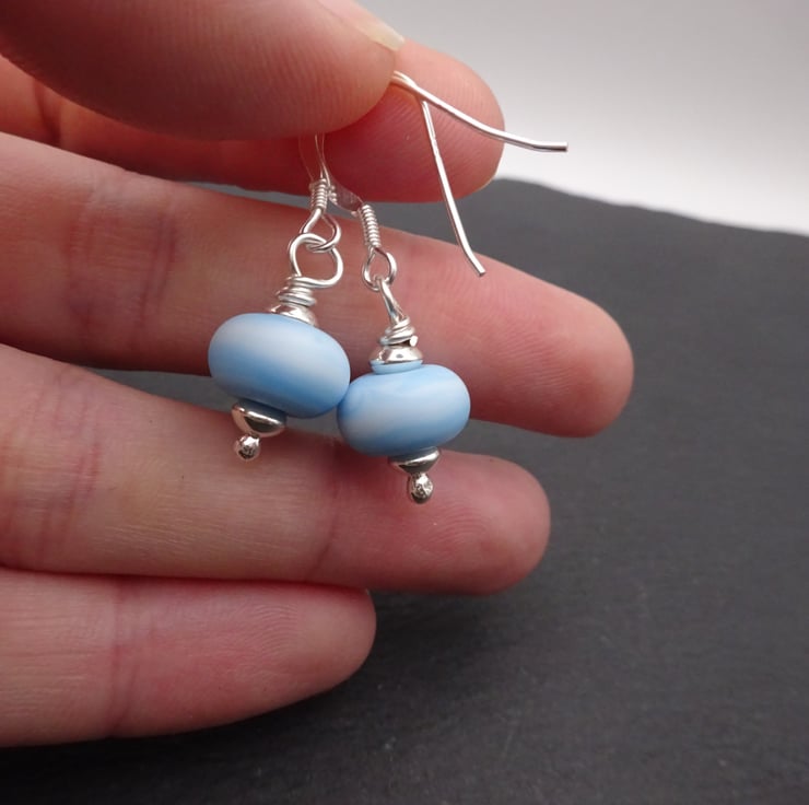 A pair of earrings made with sterling silver ear wires, sterling silver beads and handmade lampwork glass beads.