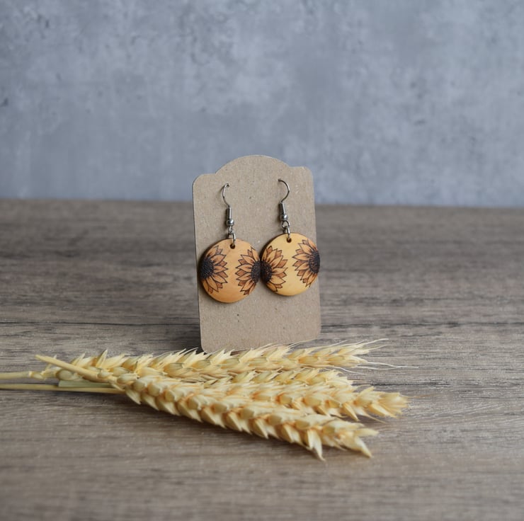 Made to Order - beautiful light weight, casual wear earrings with a hand burnt pyrography sunflowers design.