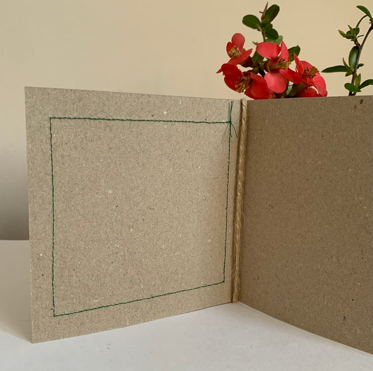 The hessian is machine stitched, using a contrasting thread, onto a plain brown recycled card. This stitching is visible on the inside of the card.