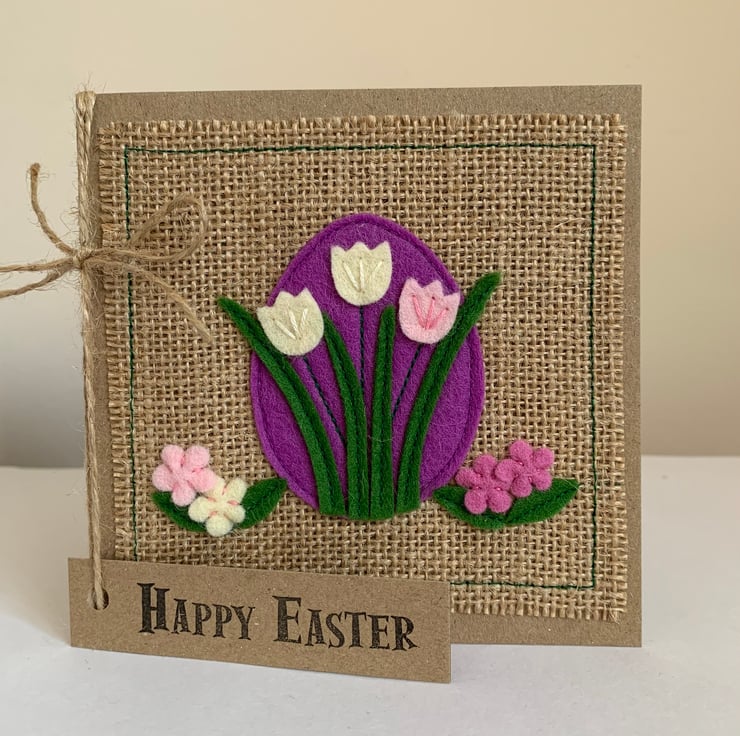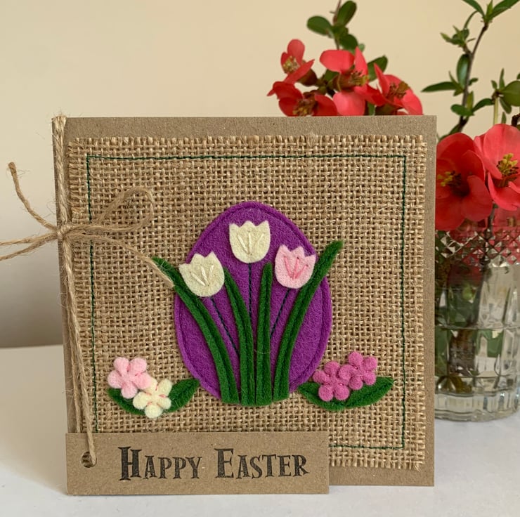 This card is decorated with cream, pink and purple flowers. The decoration is hand cut from 100% wool felt and sewn by hand and machine onto a hessian background.