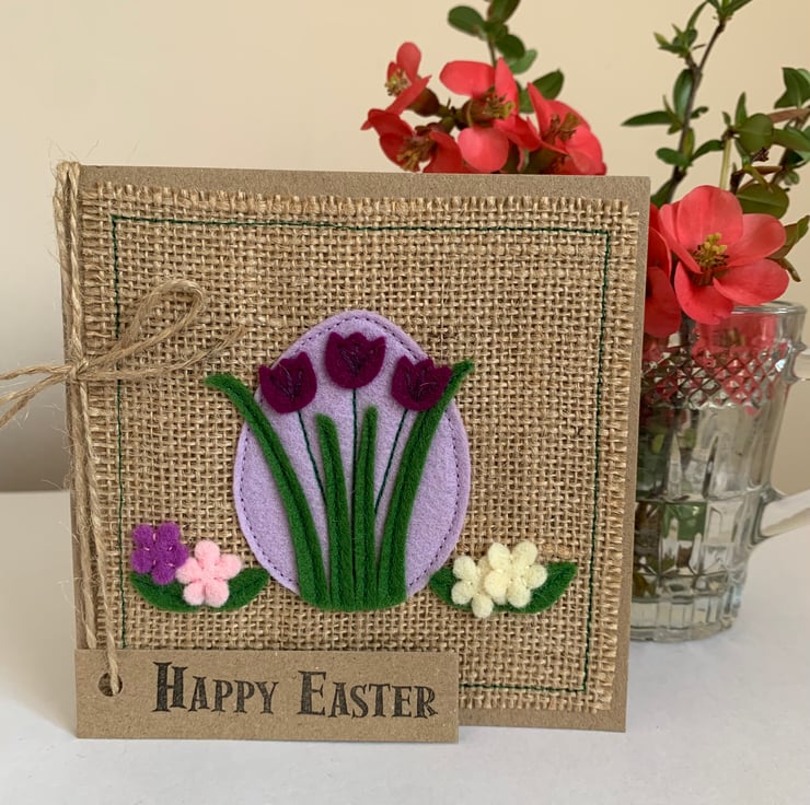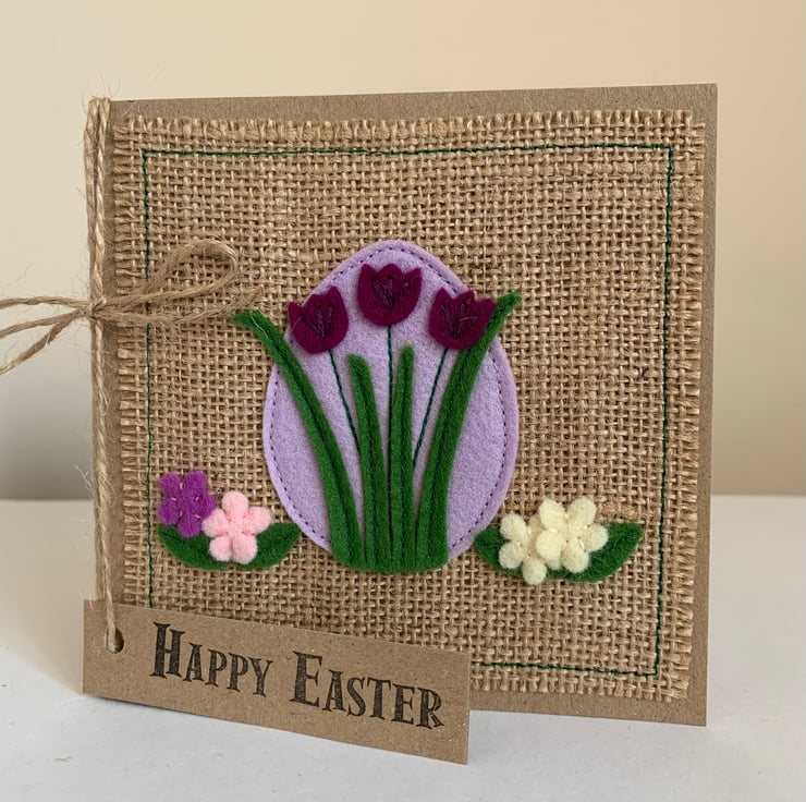 This card is decorated with purple, pink and cream flowers. The decoration is hand cut from 100% wool felt and sewn by hand and machine onto a hessian background.