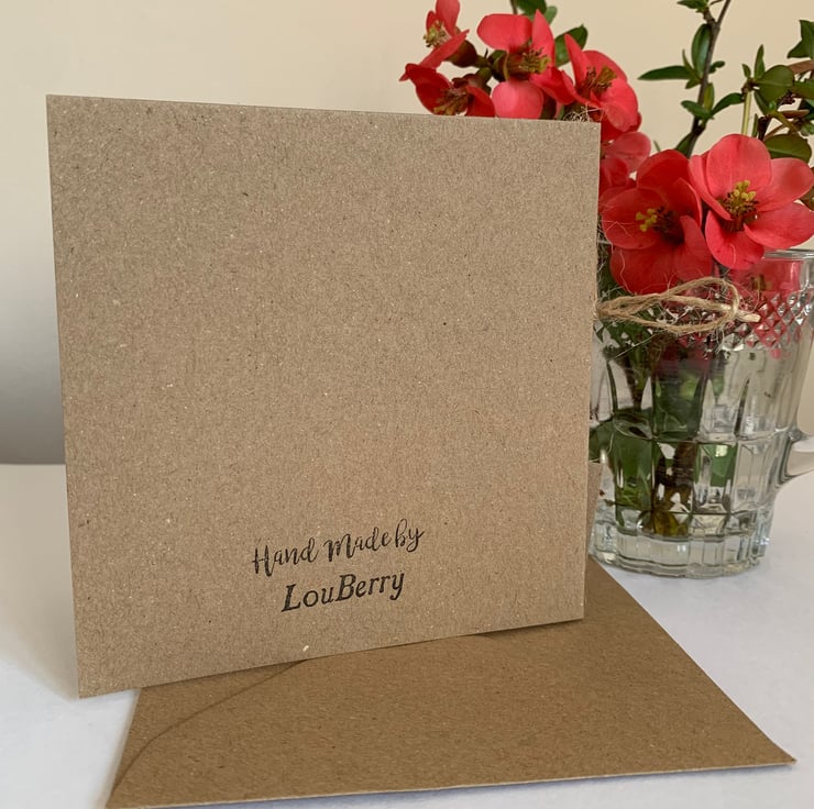 The card measures 5x5 inches and is supplied with a matching envelope. For delivery the card will be wrapped in tissue paper and posted in a boarded envelope for protection.