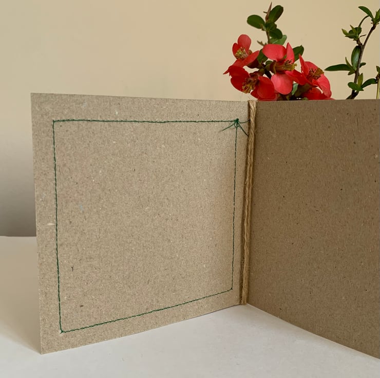 The hessian is machine stitched, using a contrasting thread, onto a plain brown recycled card. This stitching is visible on the inside of the card.