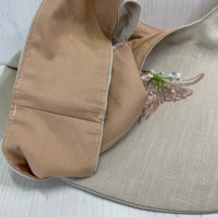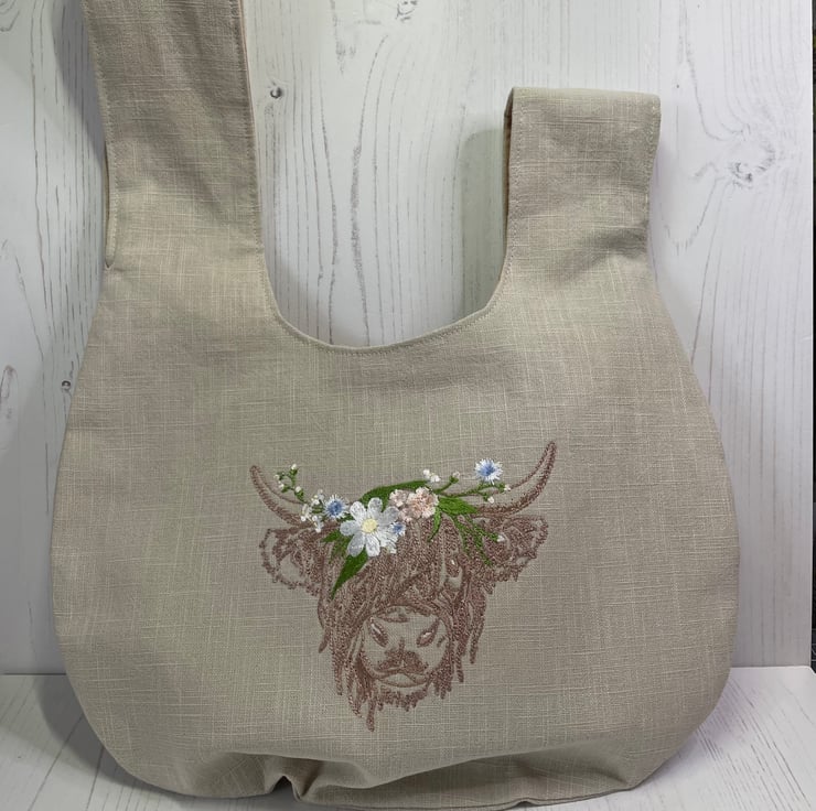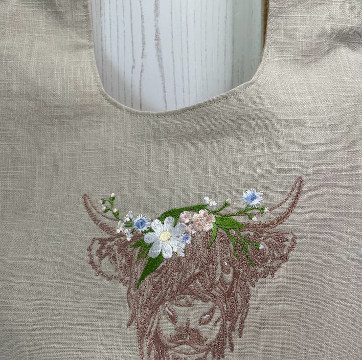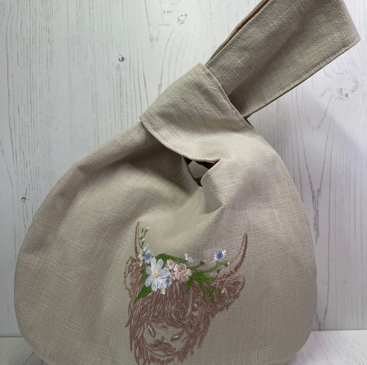 Prewashed Ecru linen fabric, embroidered with a happy highland cow image. Lined with tan cotton fabric. Measures 8.25” by 12” bag area. The longest strap 8.75” to seam. The long strap slips through the smaller and can hang from your wrist.