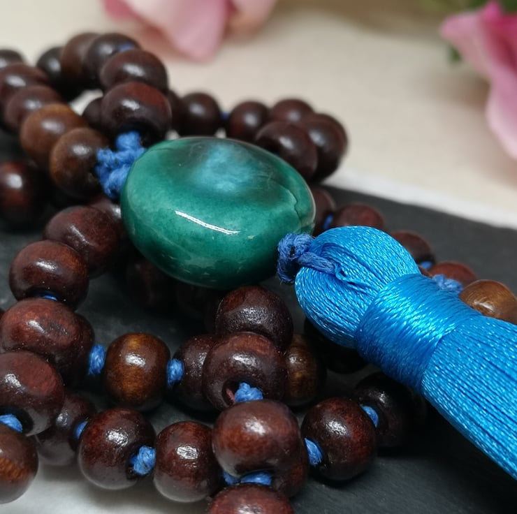 This necklace features 108 round wooden beads which have been knotted onto blue cotton cord. An emerald green ceramic bead has been used as a focal pendant with a blue tassel hanging beneath.