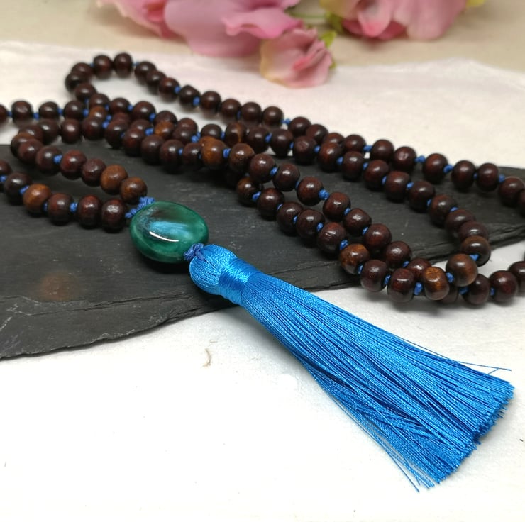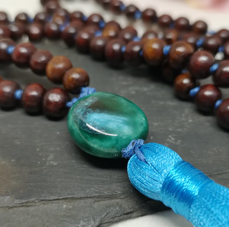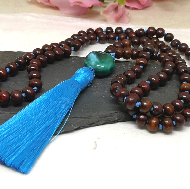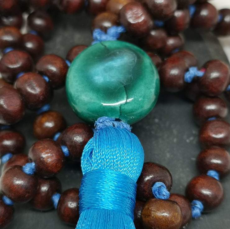 This necklace features 108 round wooden beads which have been knotted onto blue cotton cord. An emerald green ceramic bead has been used as a focal pendant with a blue tassel hanging beneath.