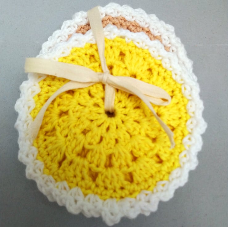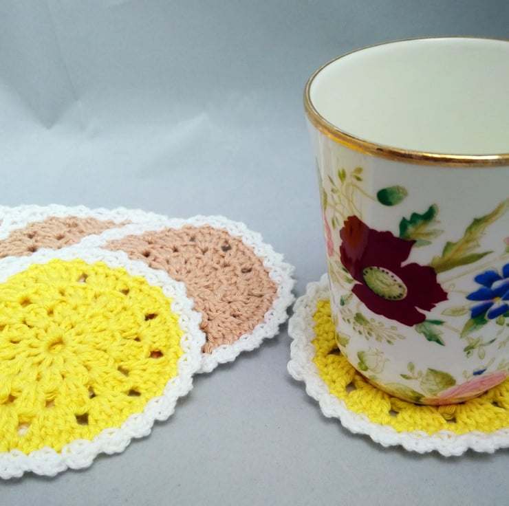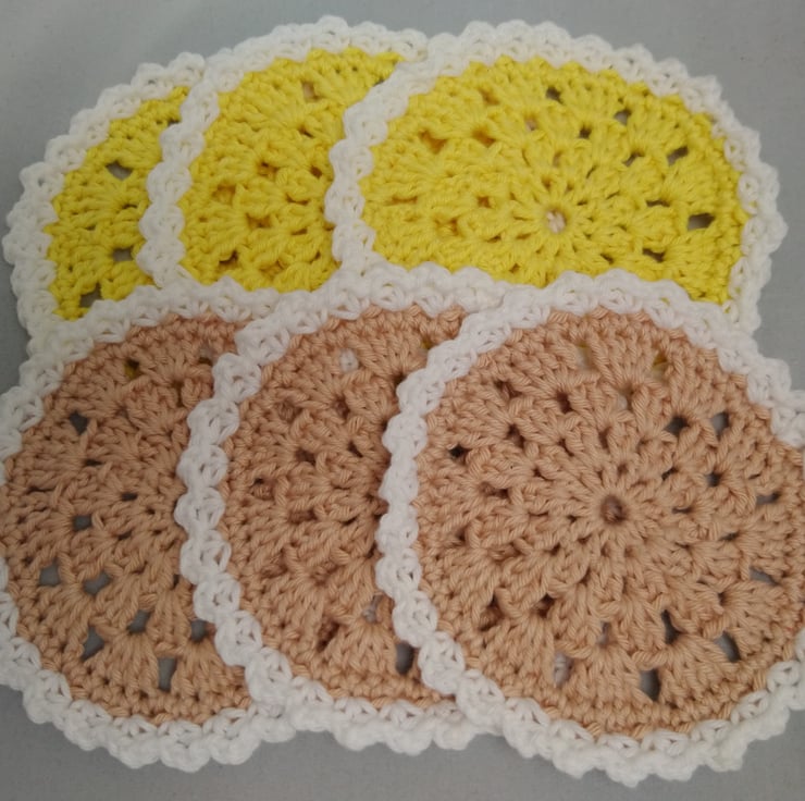 A Set of 6 Crochet Coasters in Beige and White, Yellow and White. 3 of each. Crocheted in 4 ply 100% Cotton Yarn. Lovely and soft.