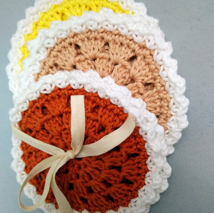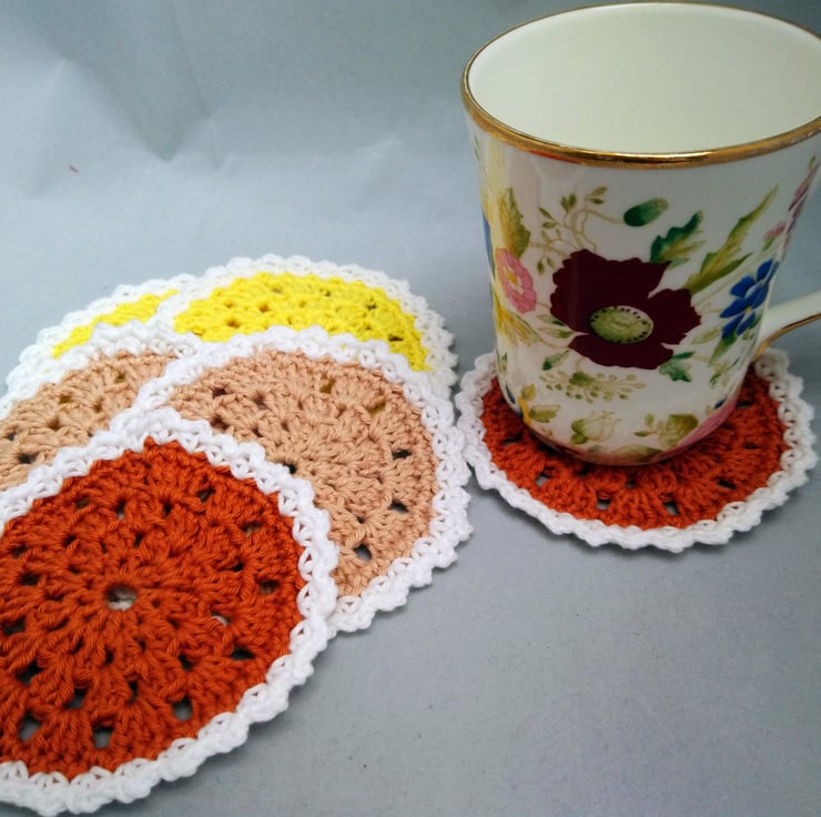A Set of 6 Crochet Coasters in Beige and White, Yellow and White, Rust/copper and White. 2 of each Crocheted in 4 ply 100% Cotton Yarn. Lovely and soft.