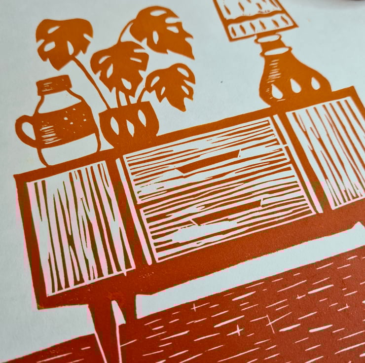 Limited edition, Original Lino Print of a mid century interior in my own home.