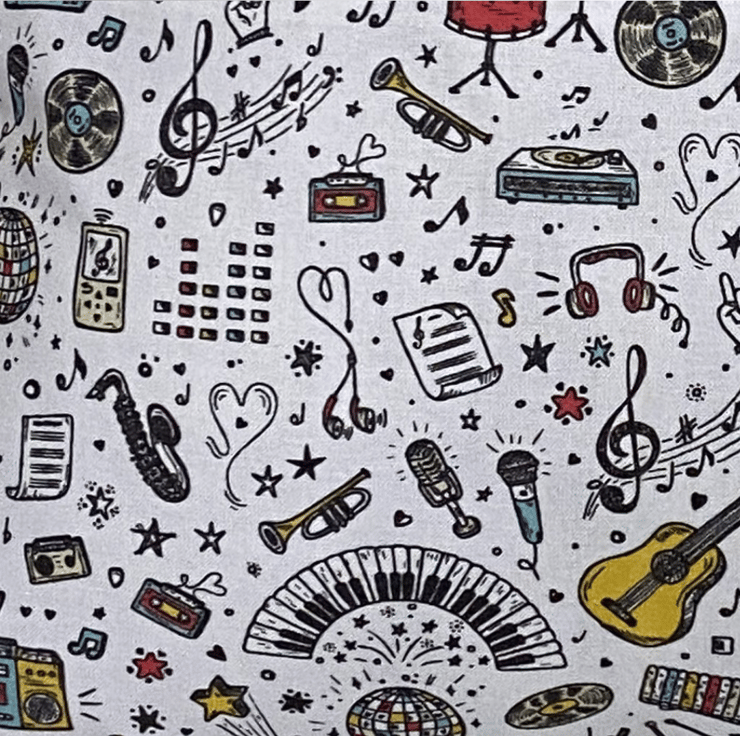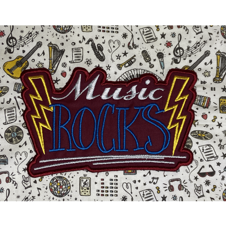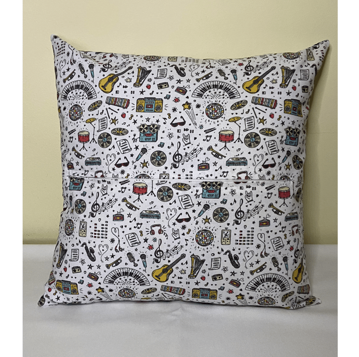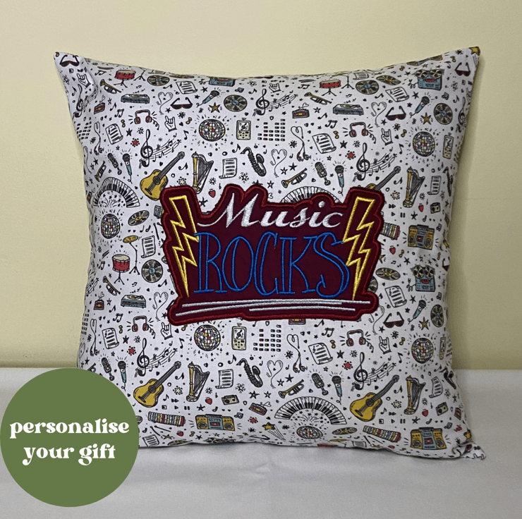 100% cotton fabric featuring images relating to many aspects of music. The centre of the cushion has an embroidered applique which reads MUSIC ROCKS. The back again features the music fabric and has a concealed zip fastening for easy insertion and removal of the cushion pad (not supplied).