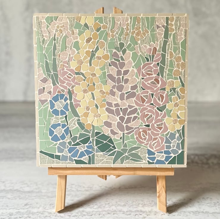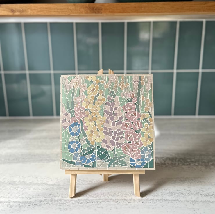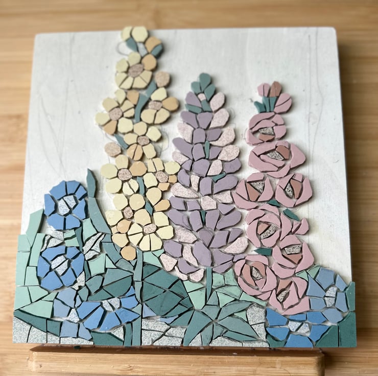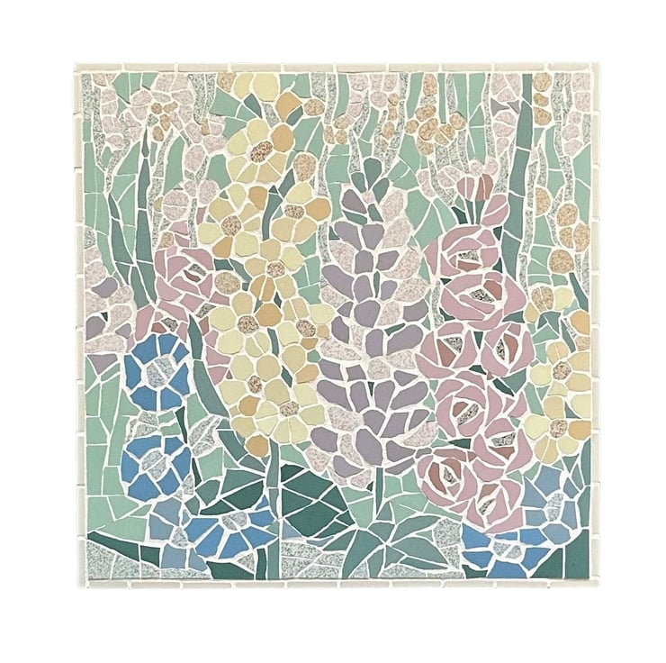 This original floral art is created in mosaic and features an intricate design of pretty long stemmed flowers in pastel tones. The grout is Jasmine, giving the piece a warm glow. I have been inspired by Lupins, Wild Roses and Cornflowers.