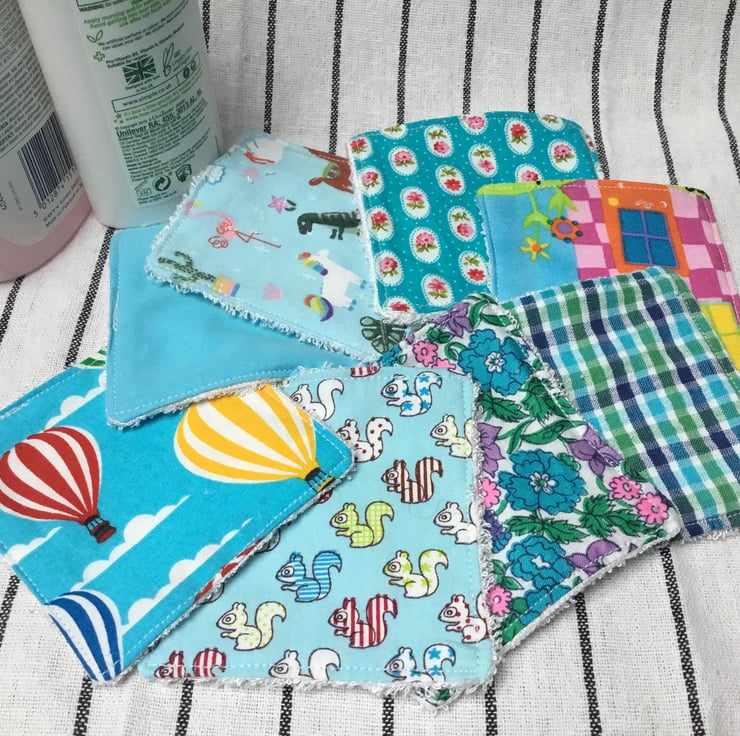 These wipes measure approximately 8cm square (they’re hand made, so there will be variations!). They are bamboo towelling (white or silver grey) on one side and backed using remnants of cotton or polyester cotton. Choose your favourite colour and you will receive wipes and storage basket in that colour scheme. To make these wipes we use up scraps that would otherwise be thrown away, consequently your wipes will not be identical to the ones illustrated.