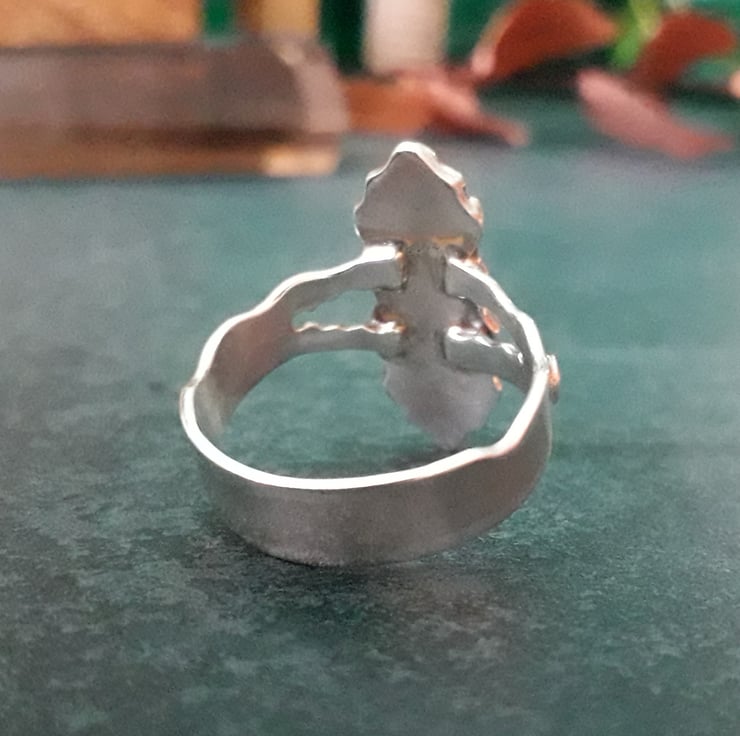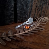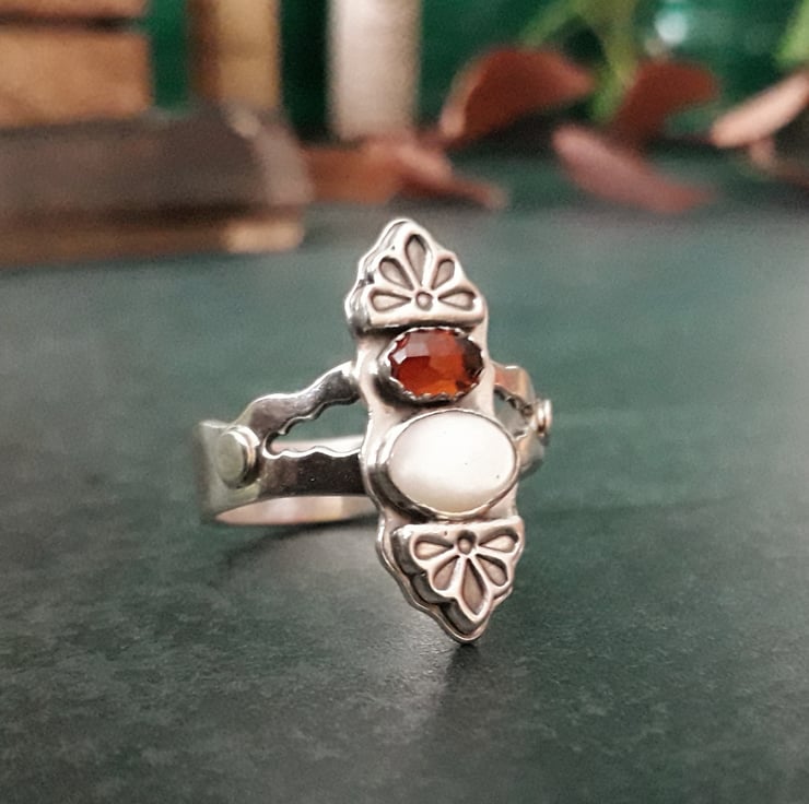 The ring has a UK size U and has polished antique silver finish. The ring band is 5mm wide. The hessonite garnet is 6mm big, the mother of pearl 8mm. It comes lovingly gift wrapped in a box and an organza pouch.