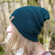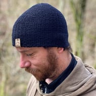 Bobble style beanie hat in colour 'Liquorice' (Black). Knitted in a double layer for optimal cosiness with 100% wool and a faux-leather tag.