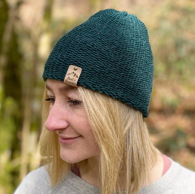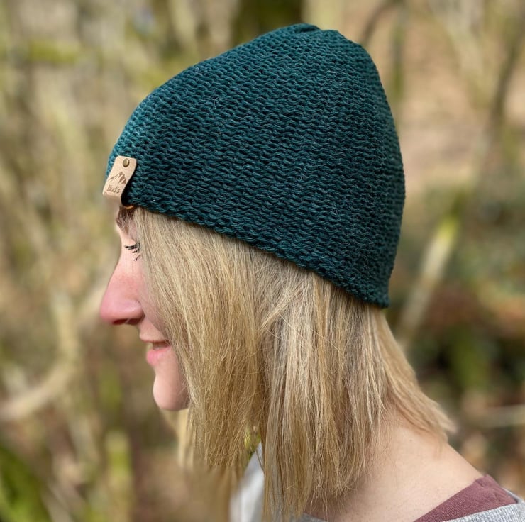 Skullcap style beanie hat in colour 'Wintergreen’ (Forest Green). Knitted in a double layer for optimal cosiness with 100% wool and a faux-leather tag.