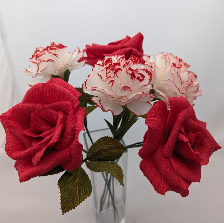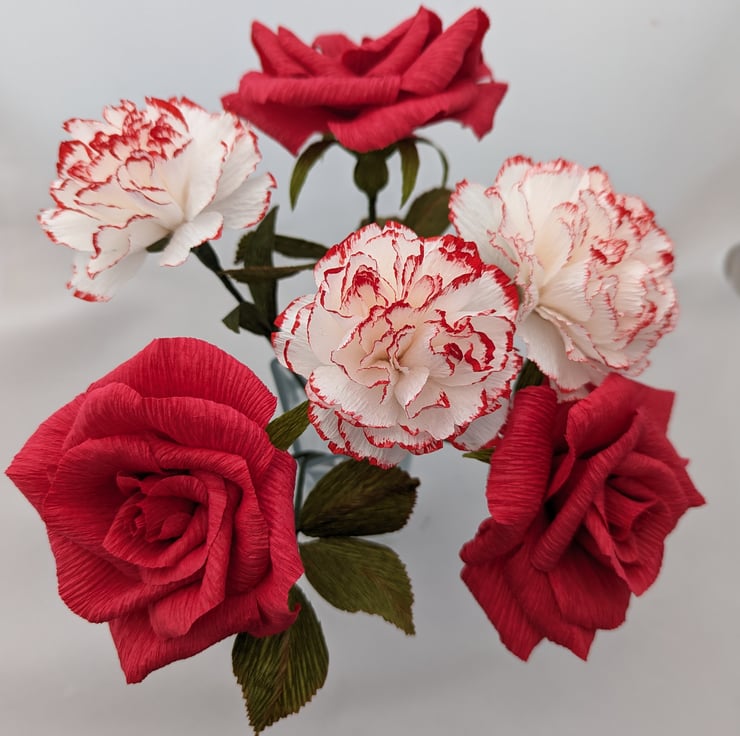 These exquisite roses and carnations are made from Italian 180gm crepe paper and are a timeless addition to any space. Lovingly handcrafted with care, each flower is unique and mimic the beauty of real flowers. These are perfect as a thoughtful gift for someone special or just for adding a touch of colour to your own home.