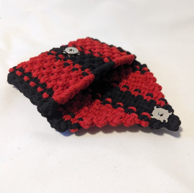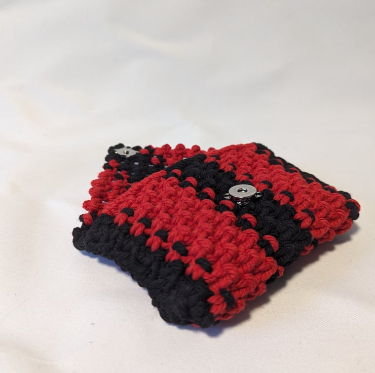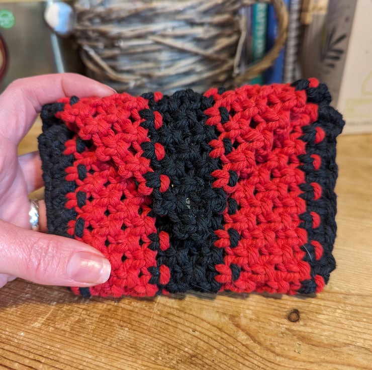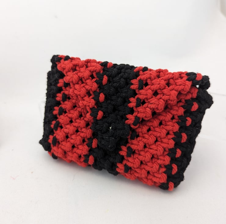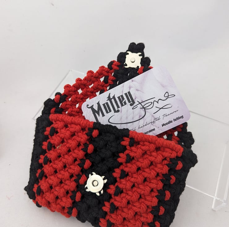 This macrame purse is made from 100% cotton macrame cord and features a bold red and black pattern with a magnetic fastener. It is the perfect size for slipping into your pocket or a handbag and will add a touch of colour to your accessory collection.