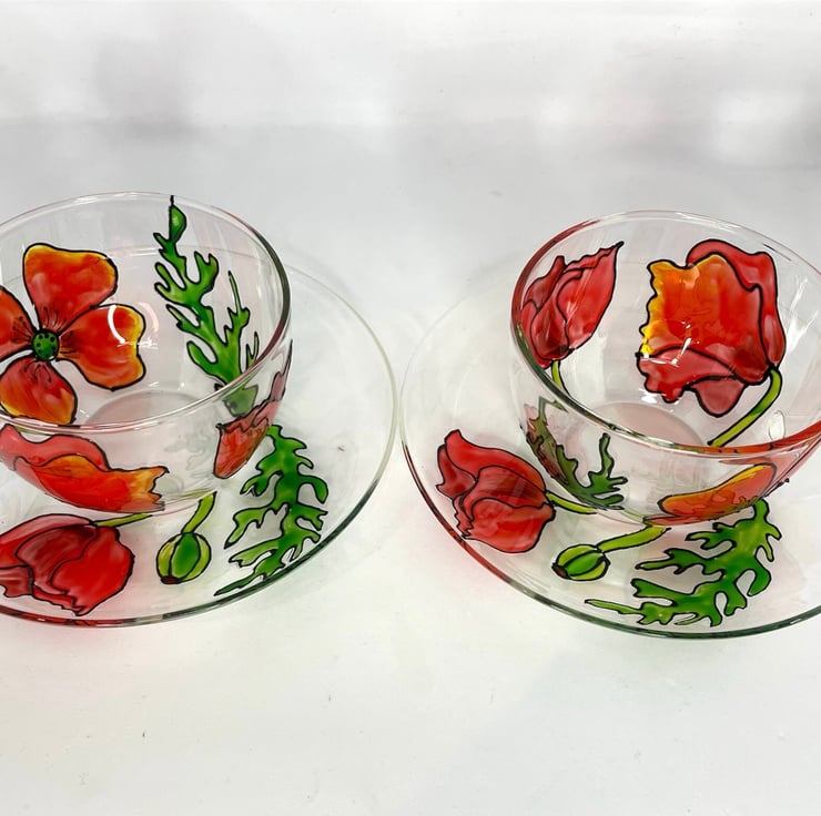Hand Painted Teapot Tea Infuser Glass with Optional Cup and Saucer. Poppy Teapot.