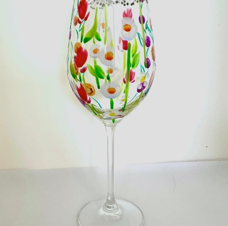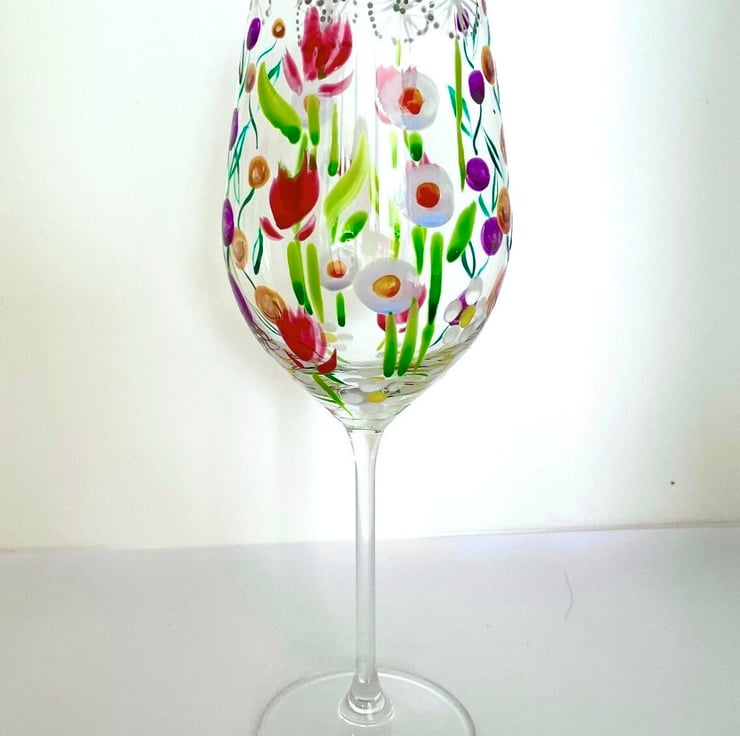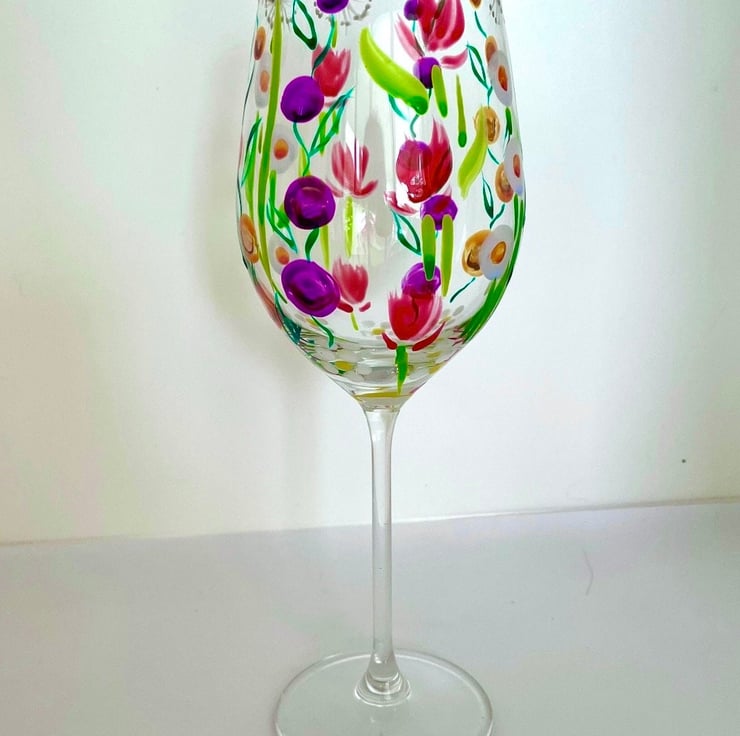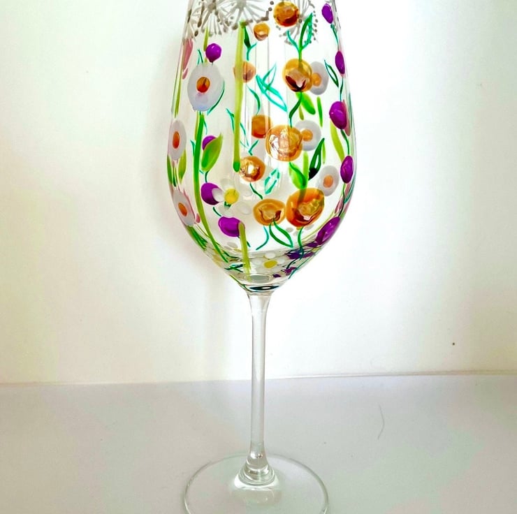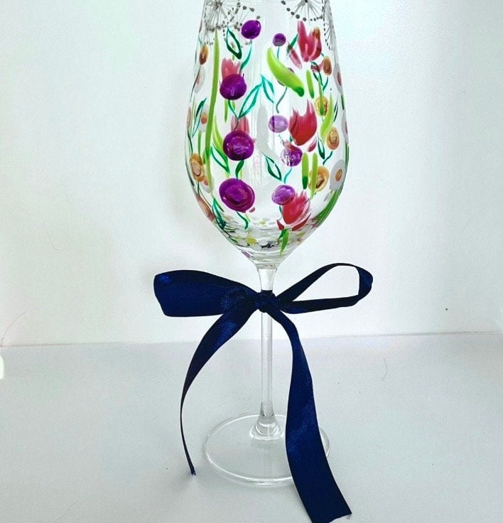 Hand Painted Wine Glass Painted with Bright Colours and a Wildflower Design.
