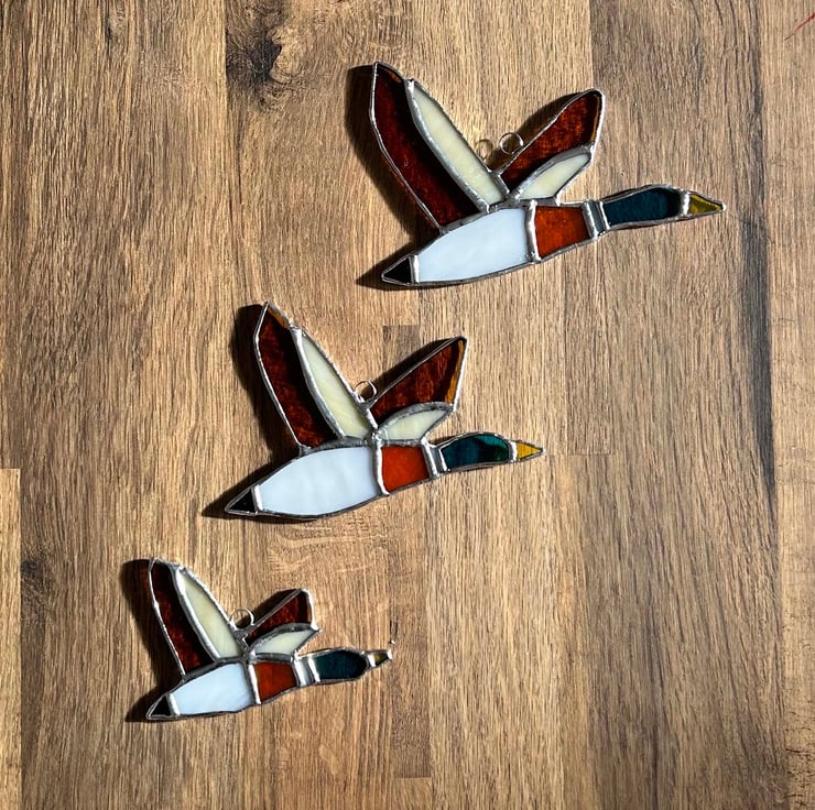 Add a touch of nostalgia to your home decor with this one-off set of Retro Flying Ducks stained glass ornaments in Tiffany Style.