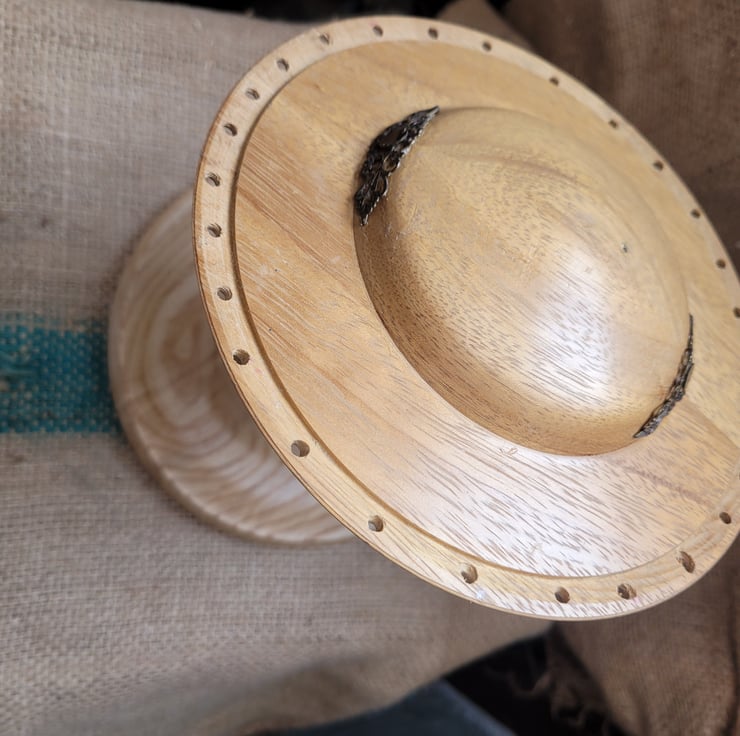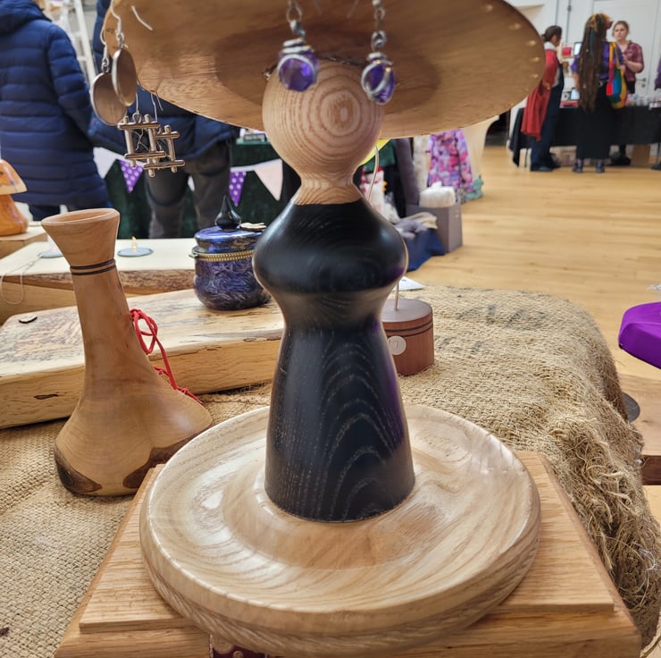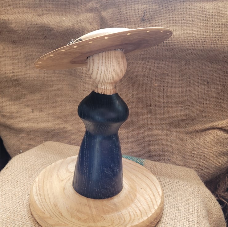 hand turned hre in my Pembrokeshire workshop. Turned in the form of an elegant lady it has a tray for bracelets rings etc and the brim of the hat has room for plenty of earrings.