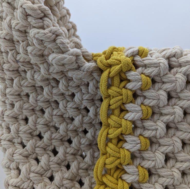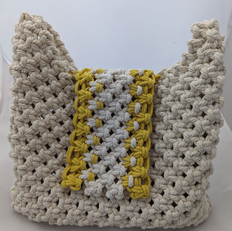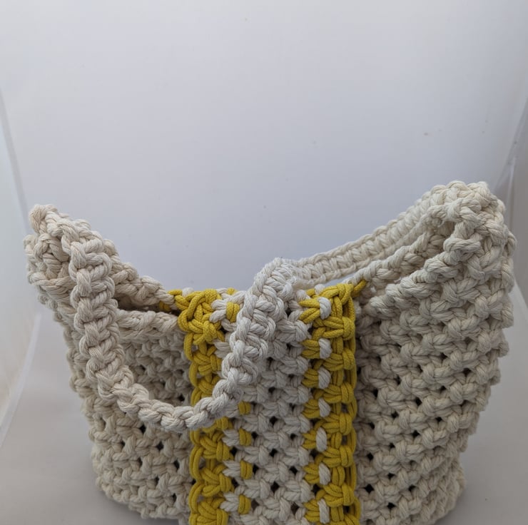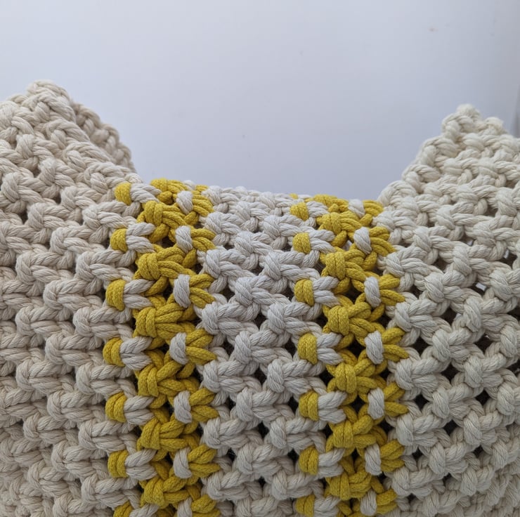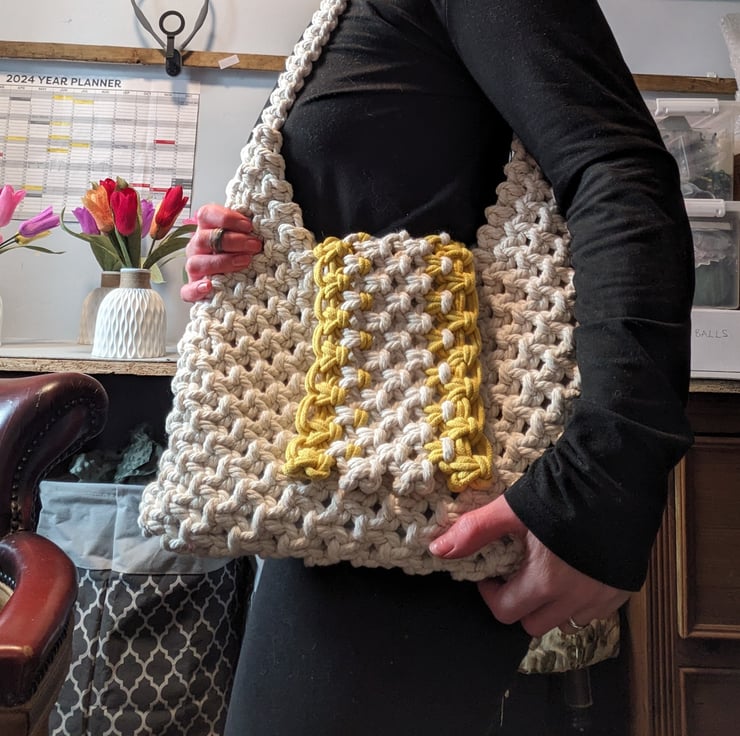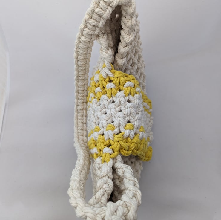 This gorgeous macrame shoulder bag is made from 100% cotton cord and features an alternating square knot pattern in a distinct two-tone colour palette. The bag features a fold over tab and is perfect for all your day-to-day essentials.