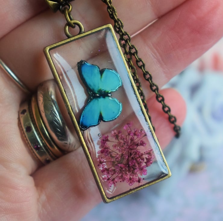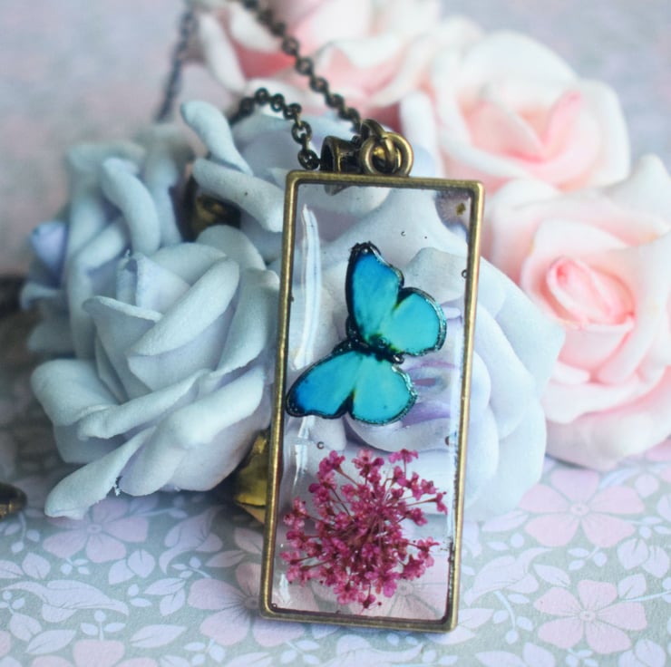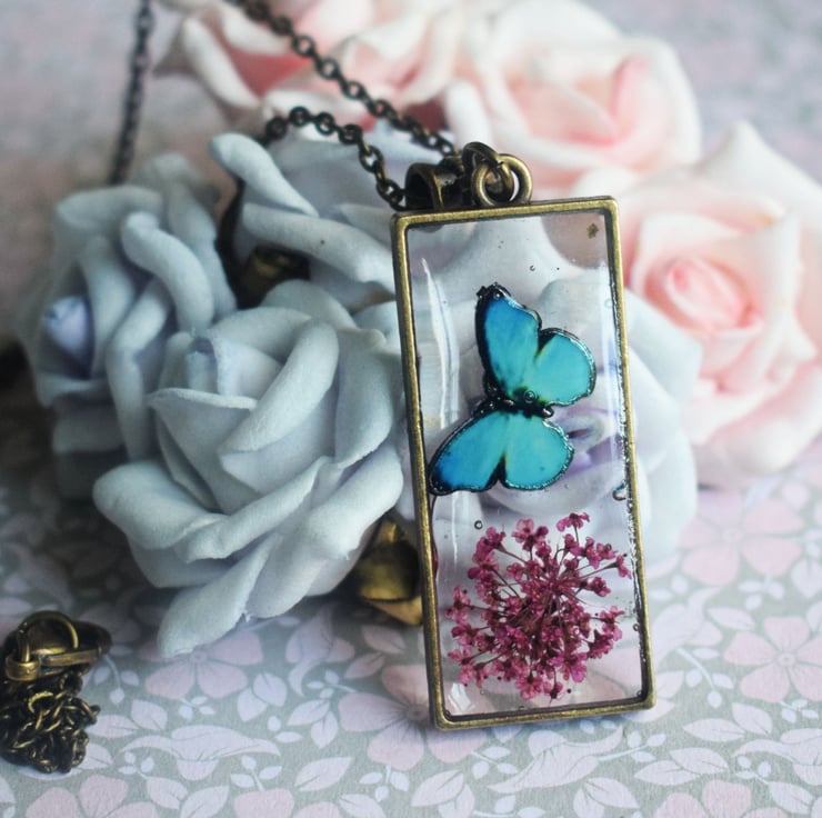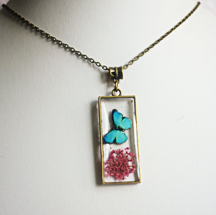 The little blue butterfly is hovering over the flower all ecased in a bronze pendant filled with clear resin. The pendant is just over 2 inches high including the bail and just under an inch wide.