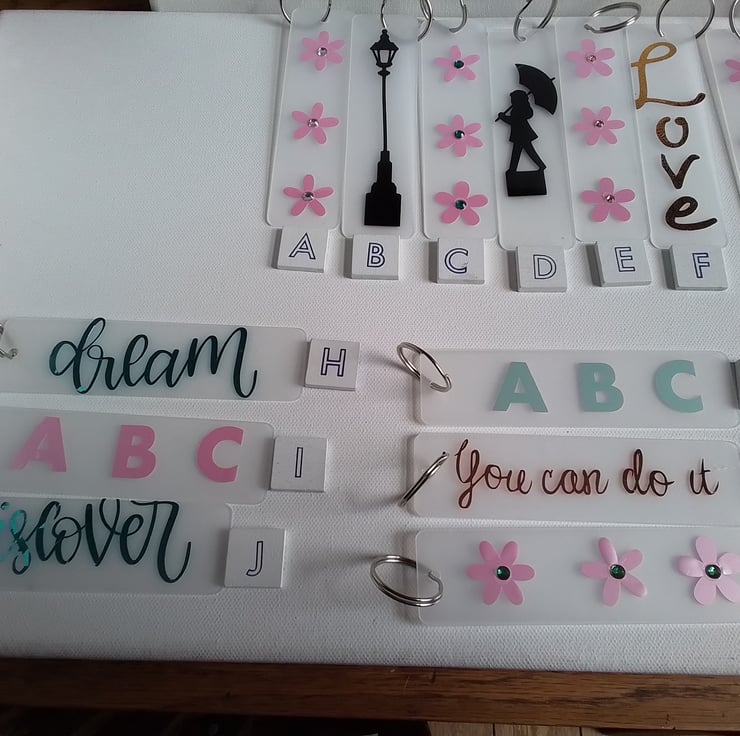I have made this small selection of keyrings and/ or bookmarks, each a bit different.