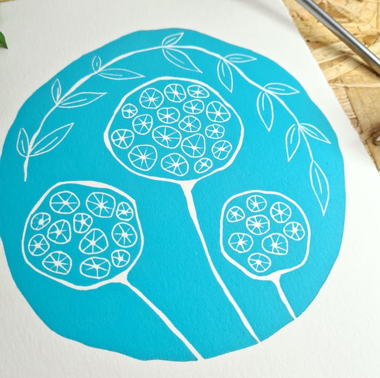 I made the print by sketching the seed heads and once I was happy with the design I transferred the it to traditional Linoleum block using tracing paper before carving around the areas I want to print. I then inked the block with oil based ink and printed on to paper. Each print takes many hours to complete.