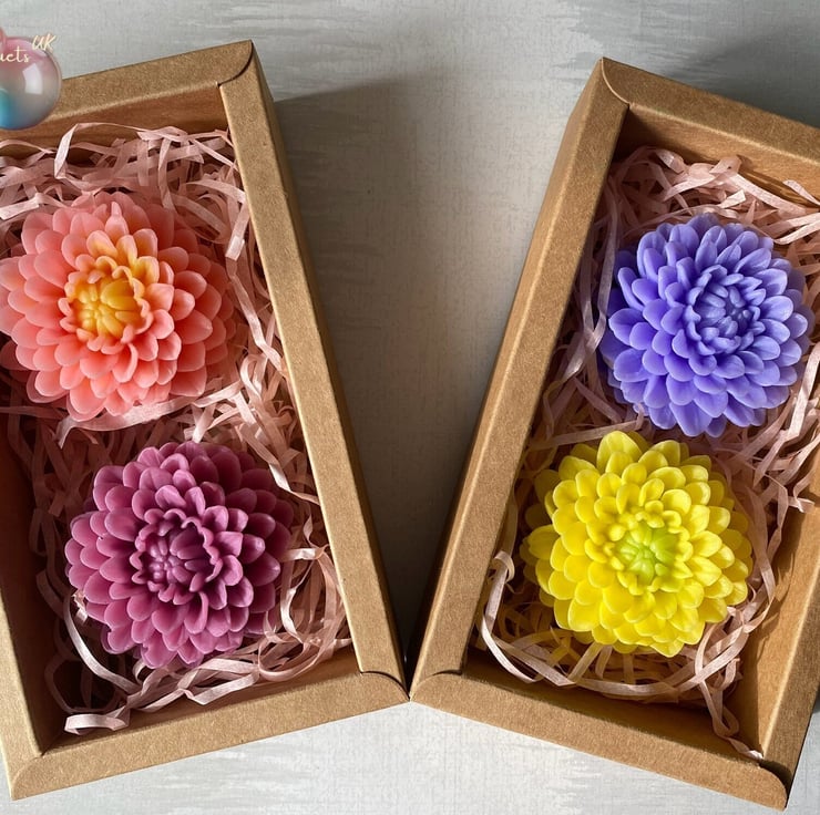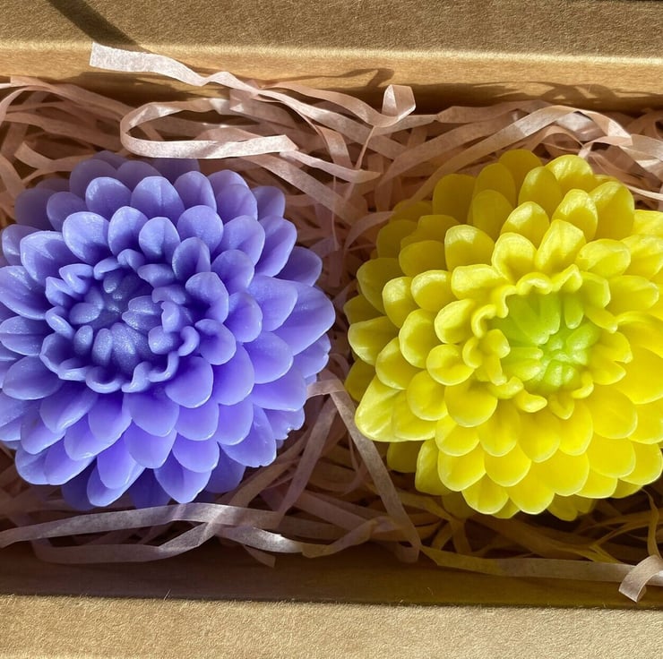 Immerse yourself in the captivating world of our Handcrafted Scented Dahlia-shaped Soap Gift Box. Experience the enchantment with 2 Blossoming Dahlia soaps, each exuding a captivating and enveloping fragrance – a truly extraordinary gift.
