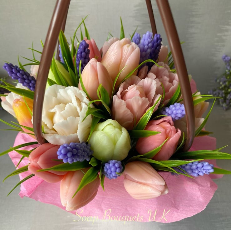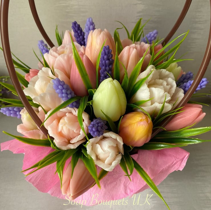 Embrace the beauty of spring with our large handmade soap bouquet featuring pastel tulips and lavender. Perfect for any occasion, this unique gift captures the essence of spring flowers with a gentle and captivating fragrance.