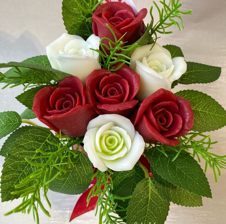 Immerse yourself in the enchanting aroma of our meticulously handcrafted soap bouquet featuring red and white roses. Each piece is a unique creation, carefully made to ensure a delightful and aromatic experience.