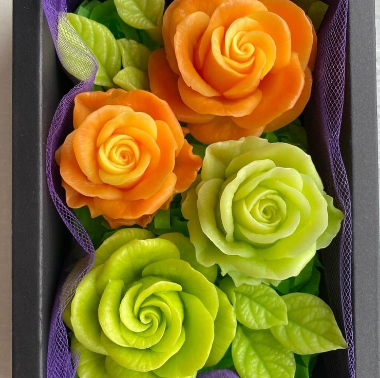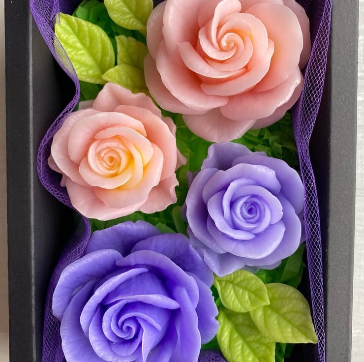 The set includes 4 rose-shaped soaps (235g), accompanied by soap leaves for added elegance. Please note that due to the handmade nature, the patterns on the roses may vary slightly from the ones shown in the photo. Each color is paired with its own unique fragrance, creating a delightful olfactory experience.