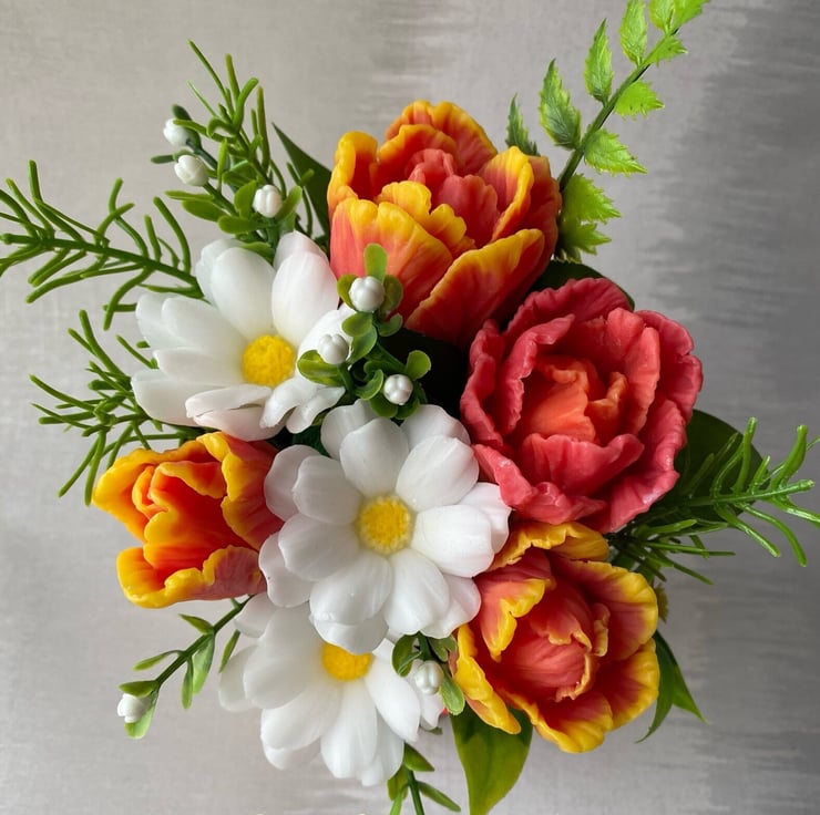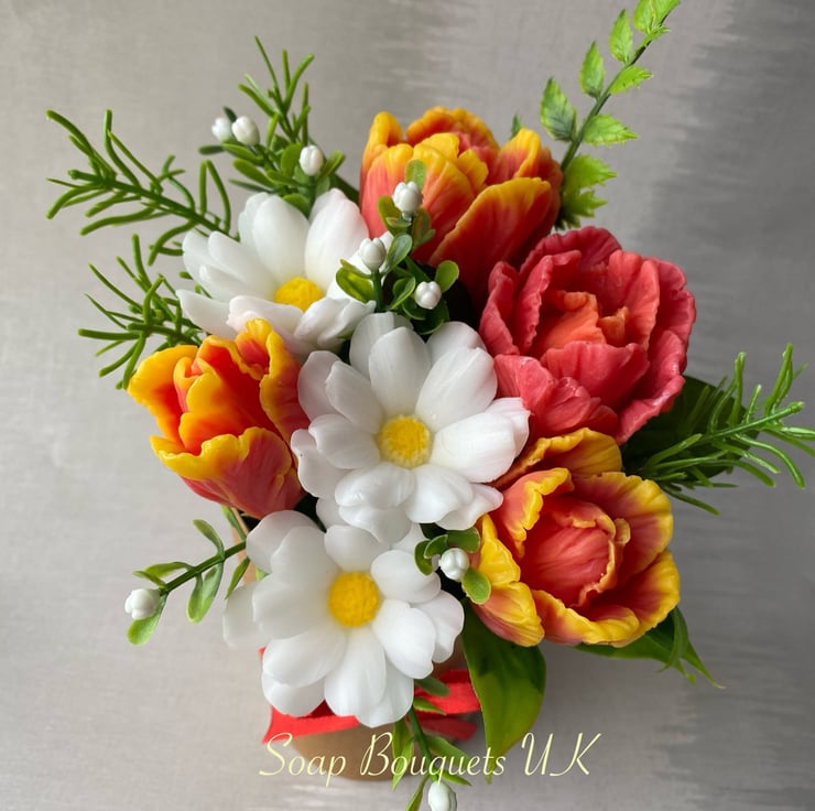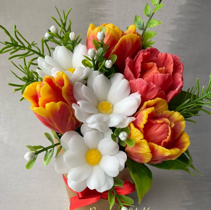 Spring-themed soap bouquet in shades of red-yellow and white (tulips, chamomiles) with a subtle fragrance of spring flowers.