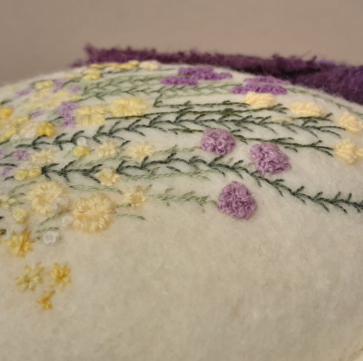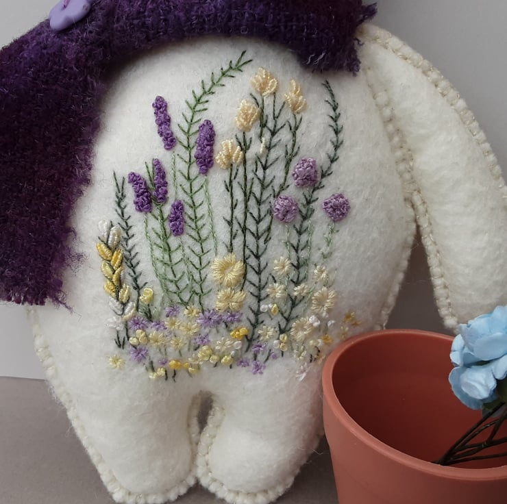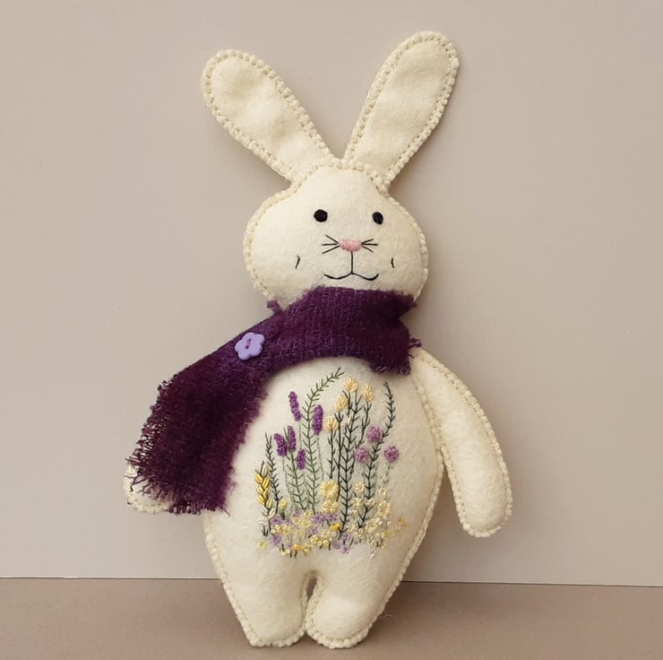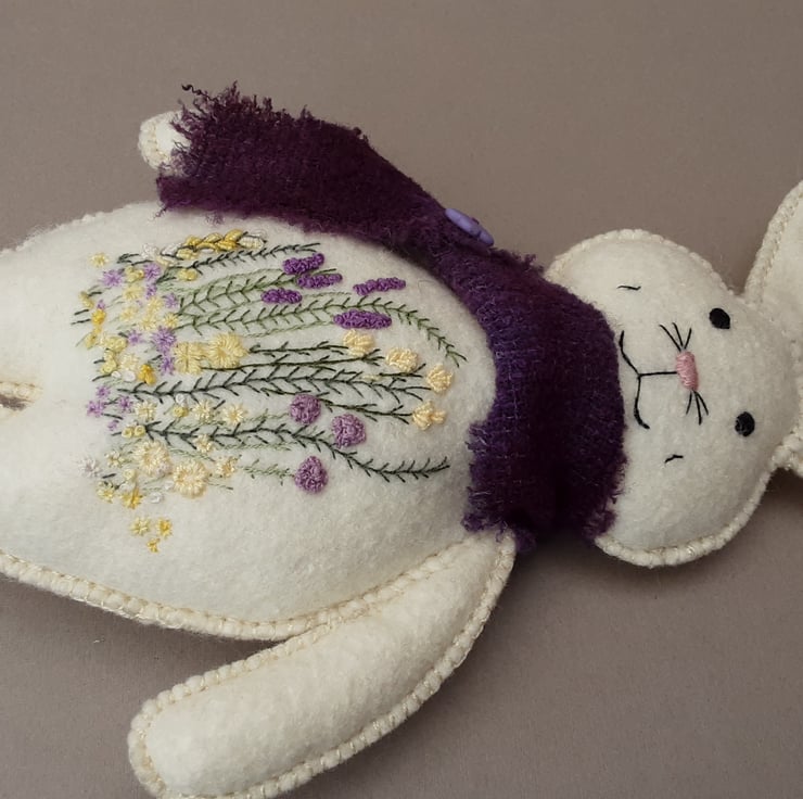 Bunny is part of the scandi style woodland collection, simply styled animal dolls created for their embroidered details. Delicate hand embroidered floral designs to her body using 1 and 2 strands from 6 stranded DMC cotton threads in lovely soft lemons and contrasting deep violets and with hand sewn facial details.