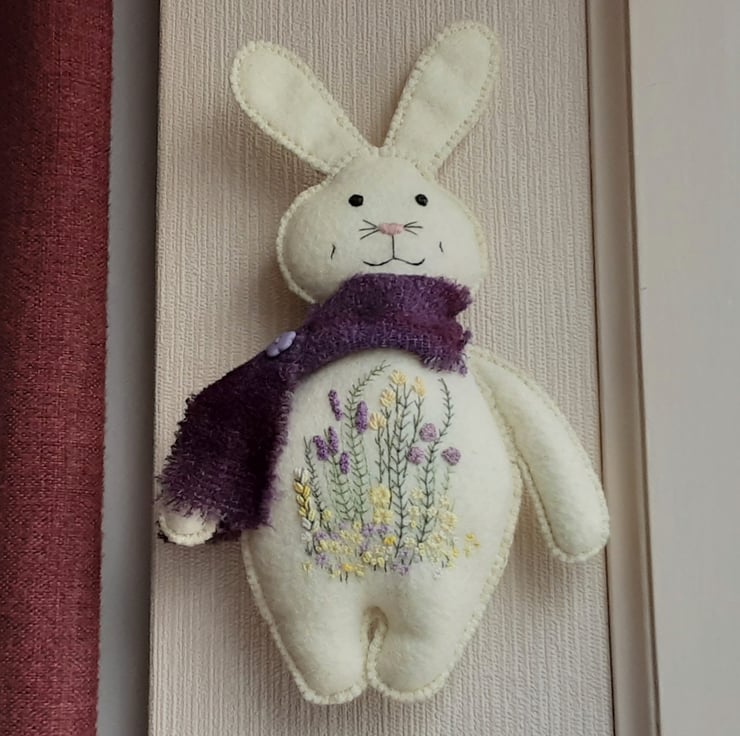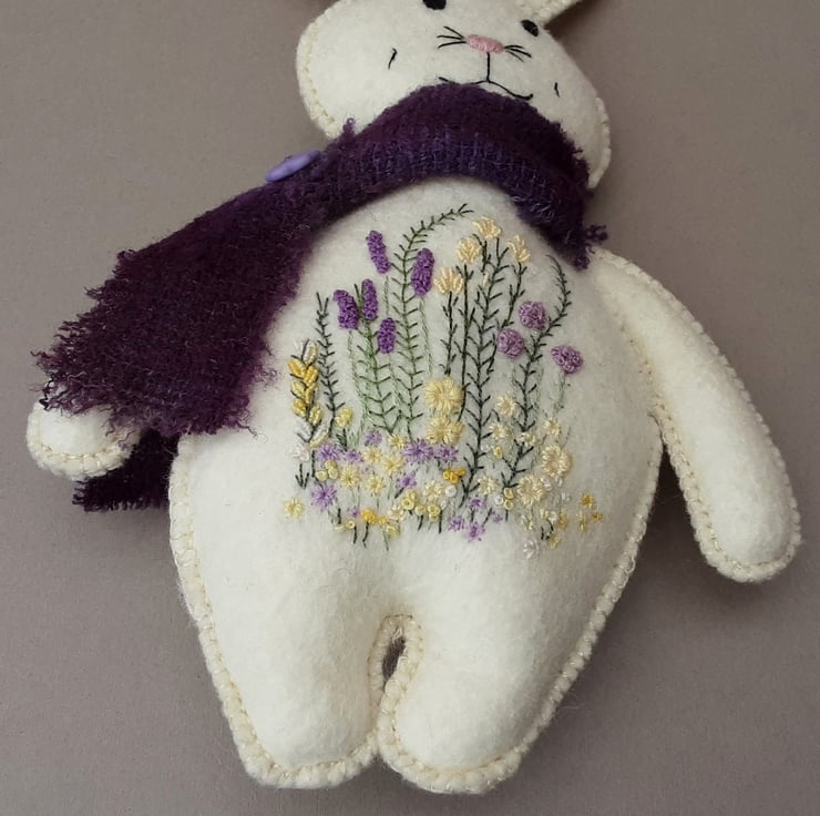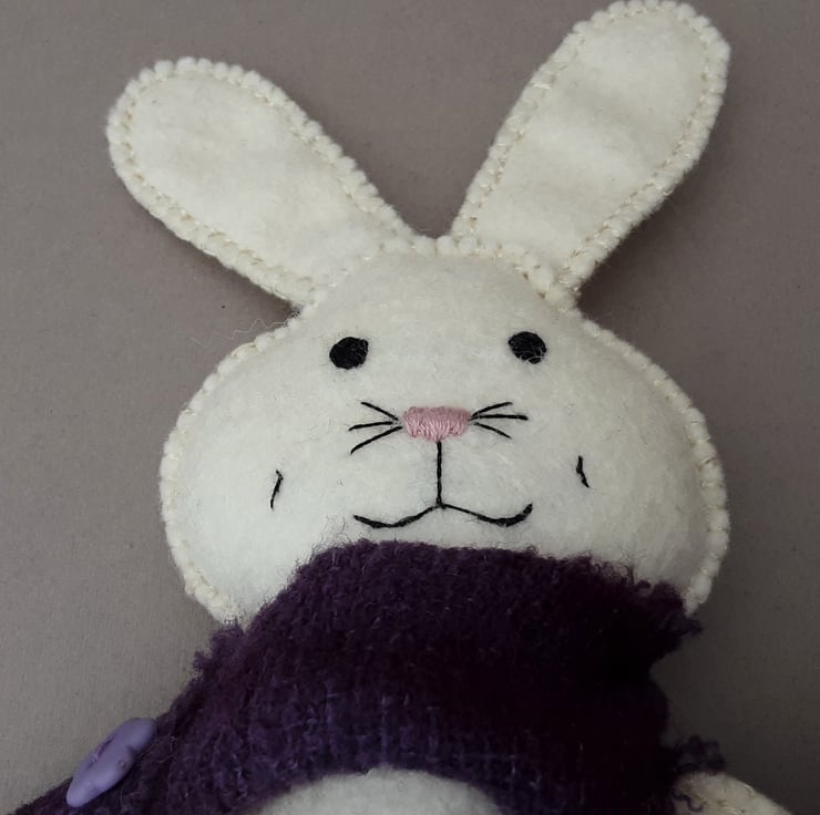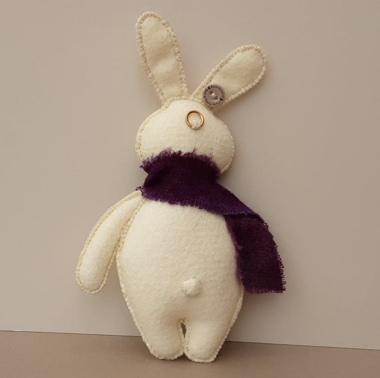 Bunny has been finished with a scarf made from a piece of hand dyed boucle wool in deep violet/purple.