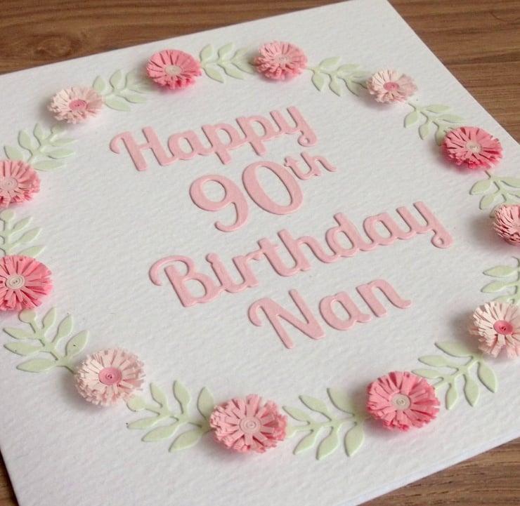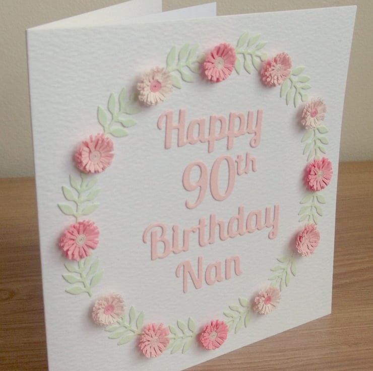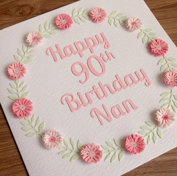 This card was made as a sample and is sold as seen. As such no personalisation is available on this card. However, if you would like a similar card which you can personalise, please go to this listing: https://folksy.com/items/6897773-Happy-90th-birthday-nan-card-paper-quilling
