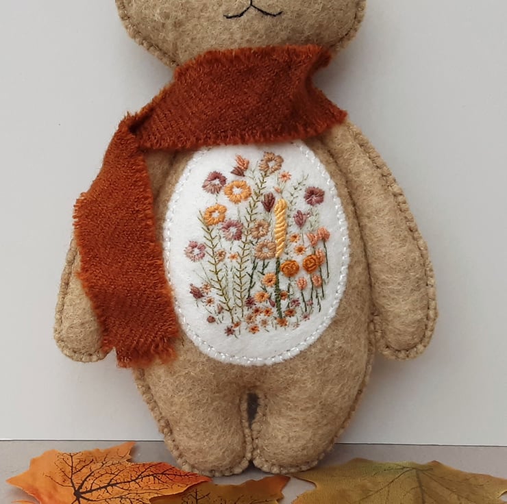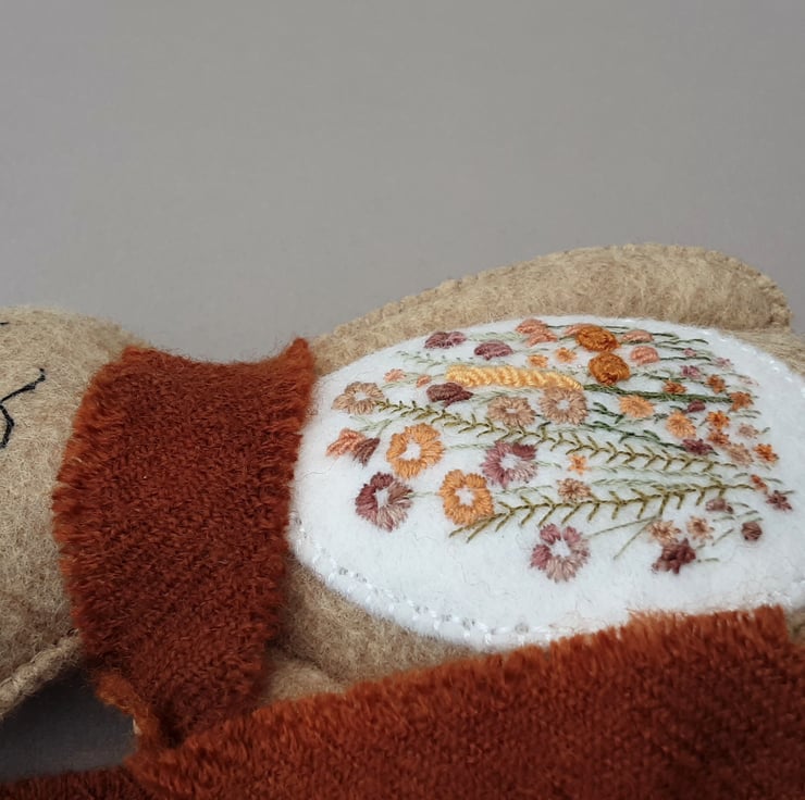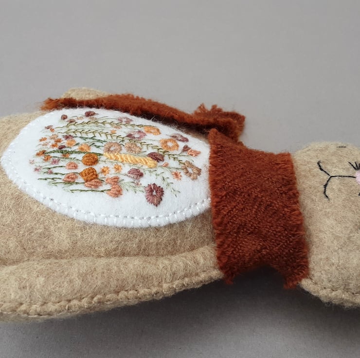 Bunny is part of the scandi style woodland collection, simply styled animal dolls created for their embroidered details. Delicate hand embroidered floral details to an ivory contrast on her body front using 1 and 2 strands from 6 stranded DMC cotton threads in lovely soft oranges, rusty browns, greens and mustard golds. She has hand sewn facial details.